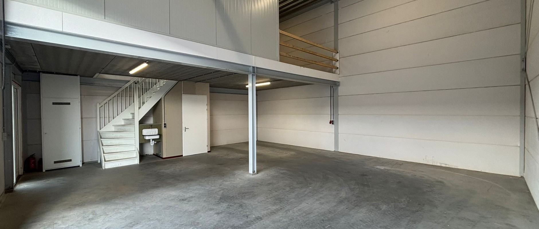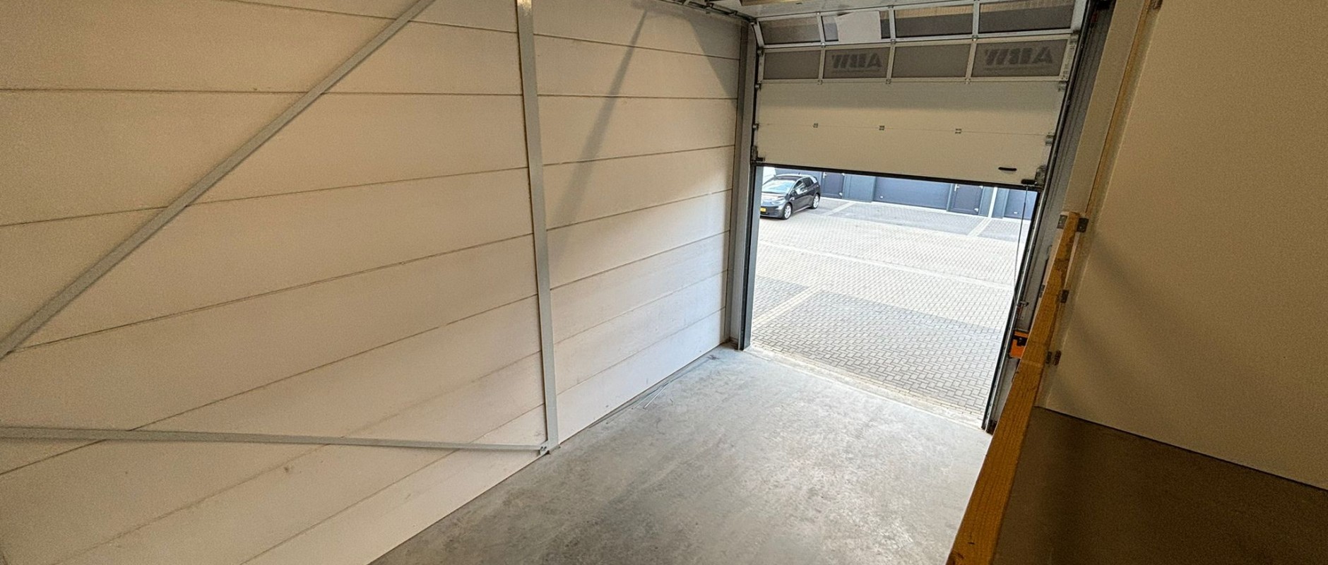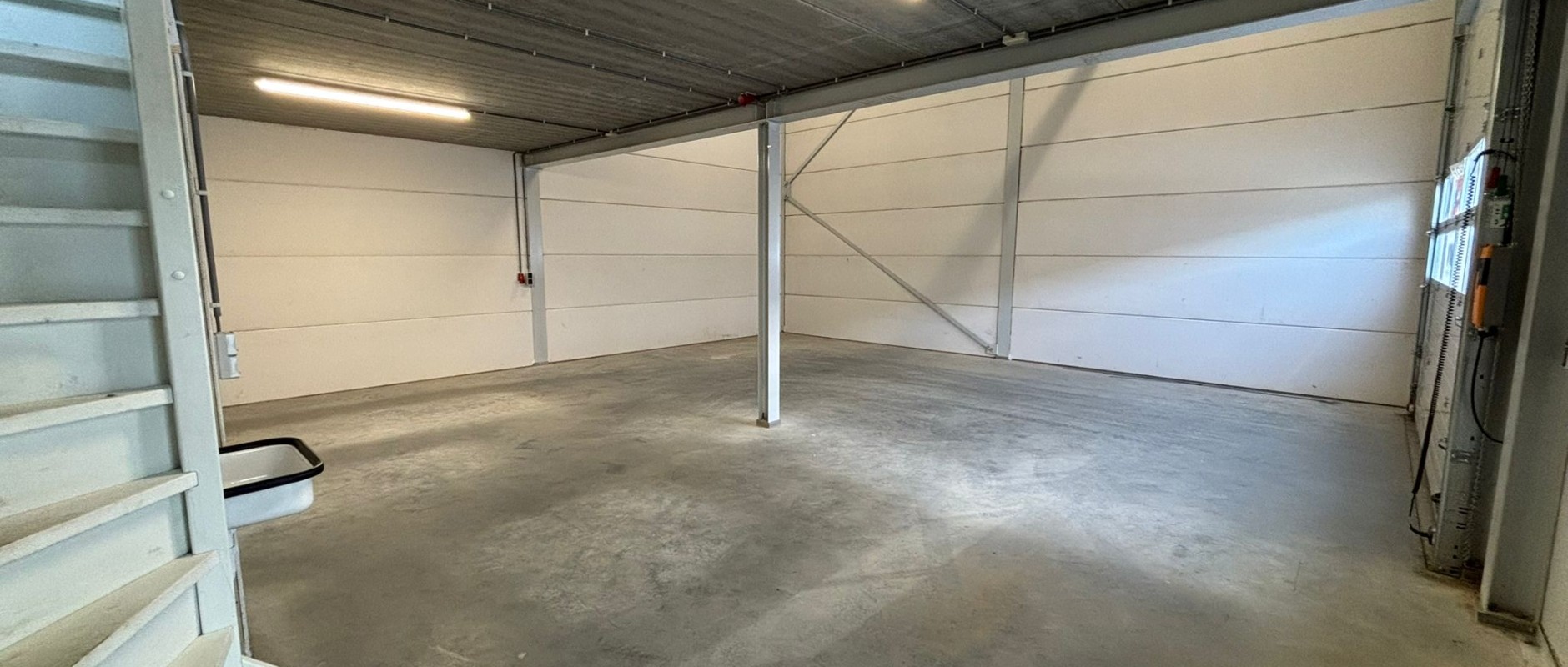 De bedrijfsruimte is goed afgewerkt, volledig geïsoleerd en voorzien van een elektrische overheaddeur alsmede van een loopdeur. Het magazijn heeft voor een deel volledige hoogte, ideaal voor opslag.