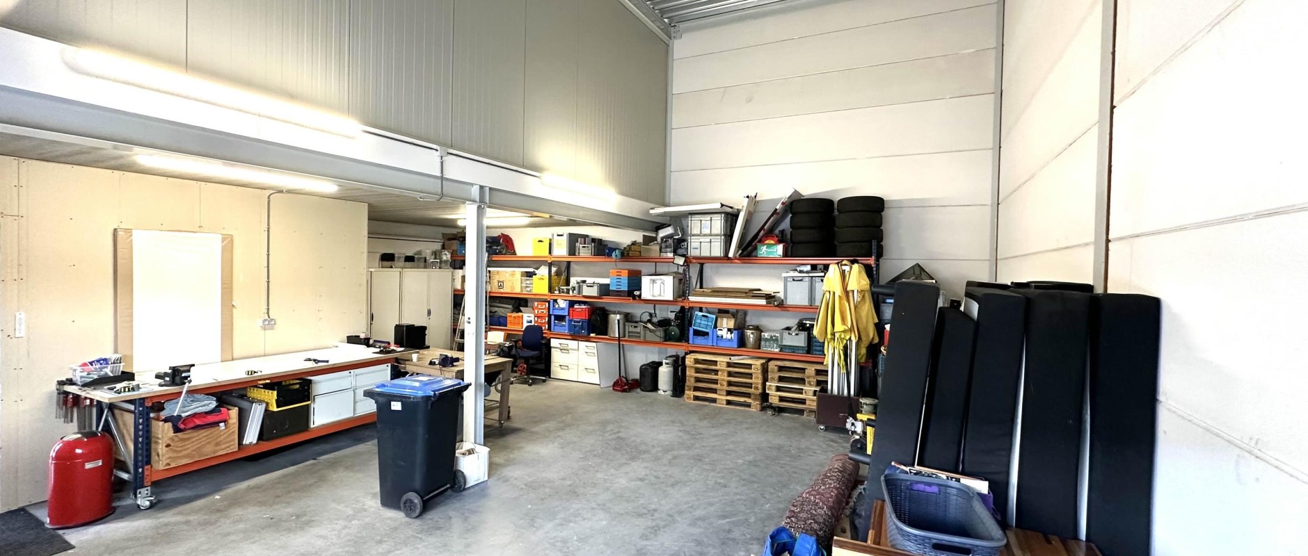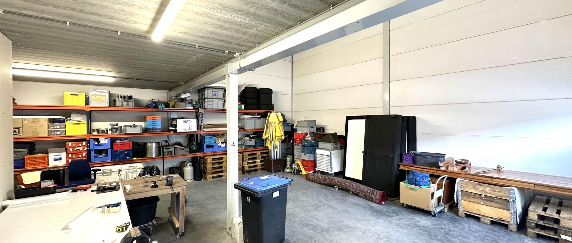 De bedrijfsruimte is goed afgewerkt, volledig geïsoleerd en voorzien van een overheaddeur alsmede van een loopdeur. Het magazijn heeft voor een deel volledige hoogte, ideaal voor opslag. De helft heeft een betonnen verdiepingsvloer, waaronder een ontvangsthal met toiletruimte, meterkast en trapopgang naar de verdieping.
