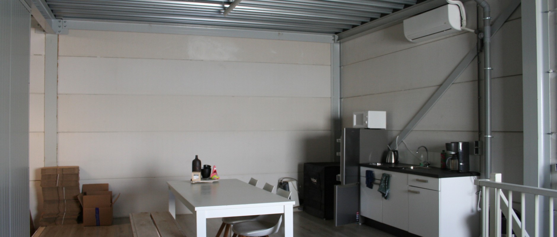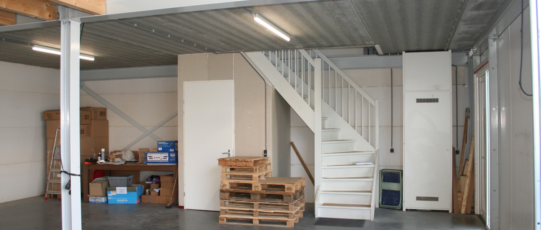 vast trap naar de betonnen verdiepingsvloer van ca. 45m². Deze verdieping beschikt over een groot raamkozijn, airconditioning, vloerverwarming en een pantry. Vanuit de betonnen verdiepingsvloer is een doorgang naar een houten verdiepingsvloer aanwezig, welke tevens demontabel is.