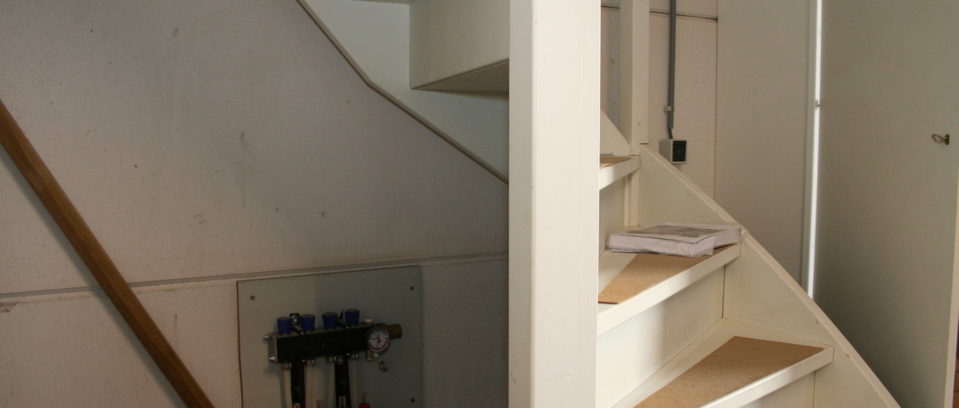 Lees verderDe helft heeft een betonnen verdiepingsvloer, waaronder een luxe toiletruimte met hangcloset, bergruimte onder de trapopgang naar de verdieping en een meterkast met krachtstroom op de begane grond. Vanuit de betonnen verdiepingsvloer is een doorgang naar een houten verdiepingsvloer aanwezig.