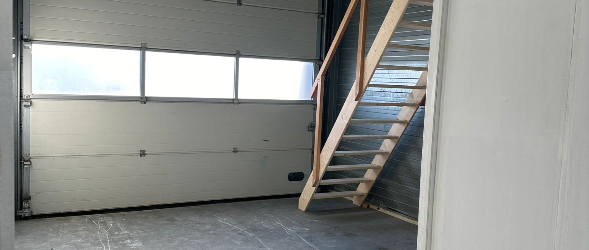 * bedrijfshal met trapopgang naar bergzolder