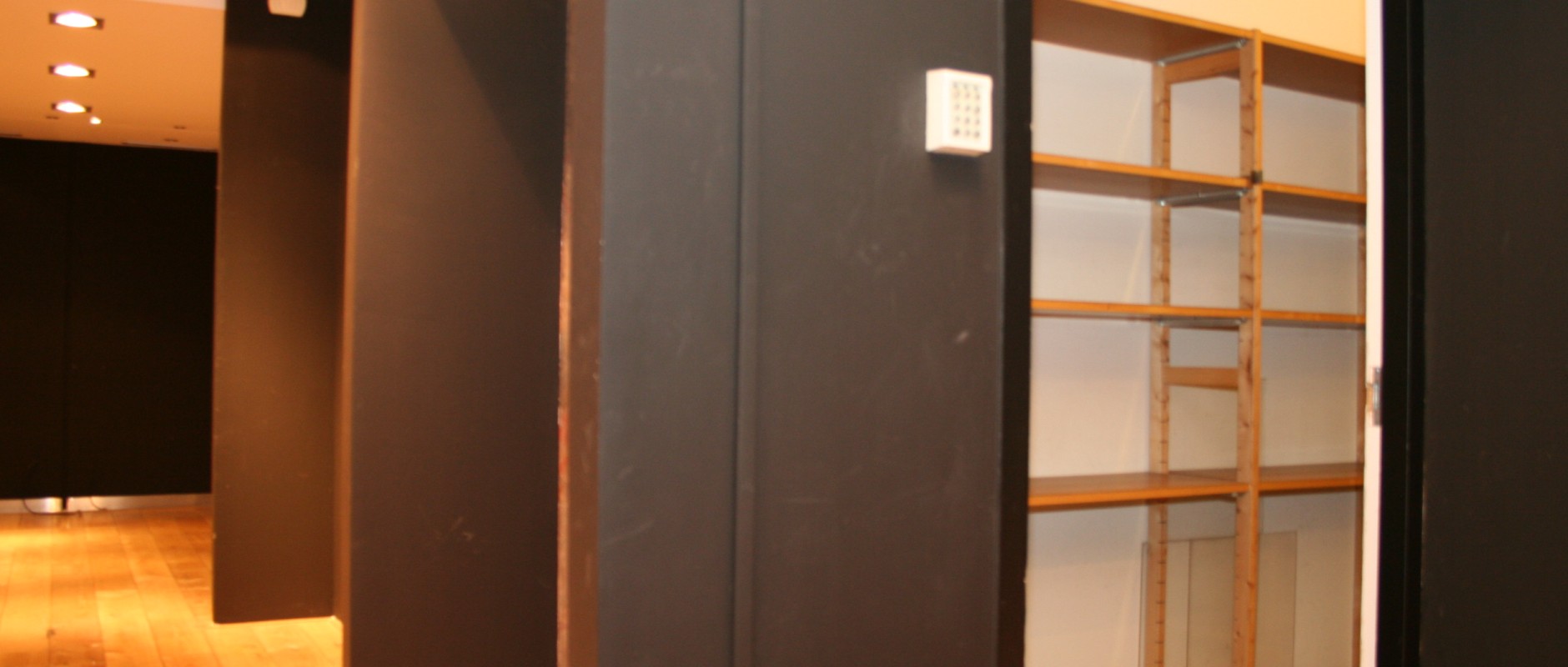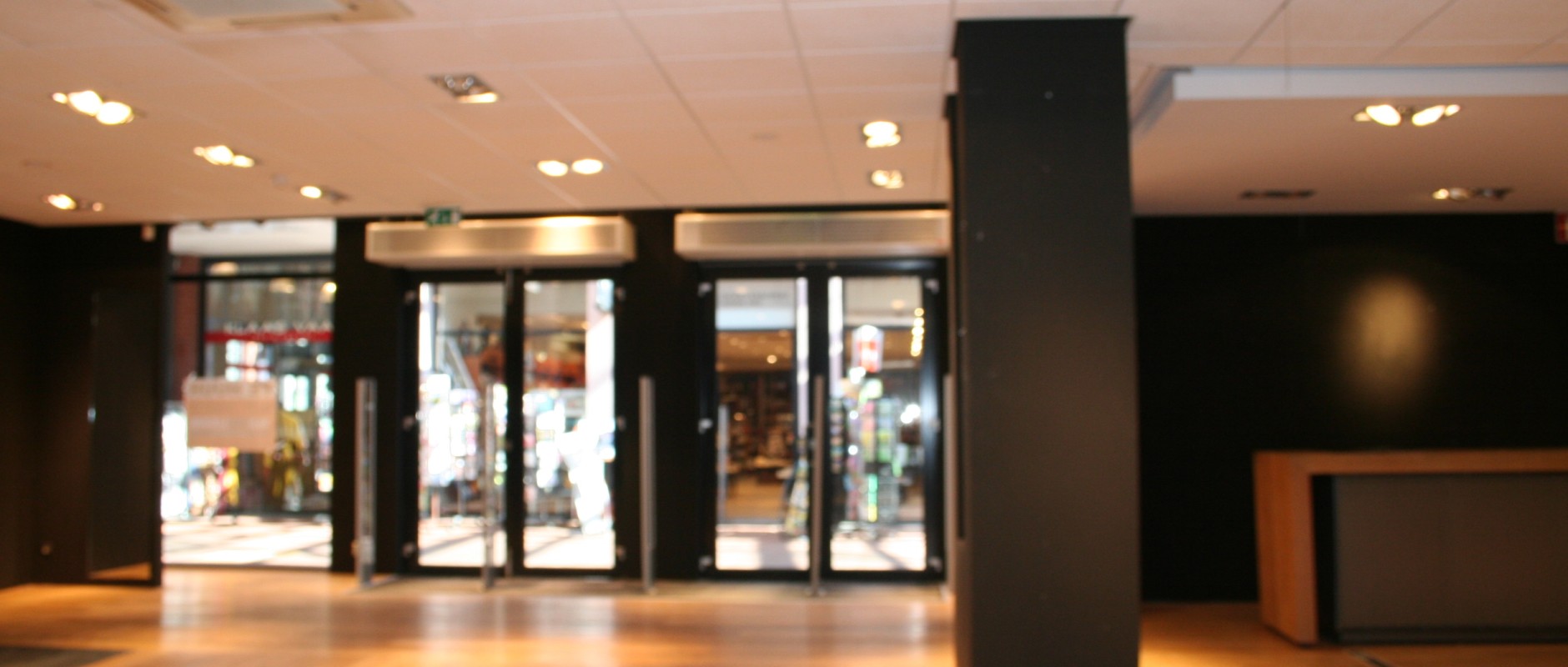 Mooie dubbele entree met openslaande deuren, alarmpoortjes en een warmtegordijn.