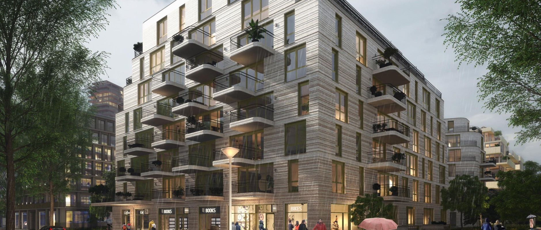 De commerciële ruimten liggen in de plint van de woongebouwen aan de Docklandsweg, die door toonaangevende architecten zijn ontworpen.