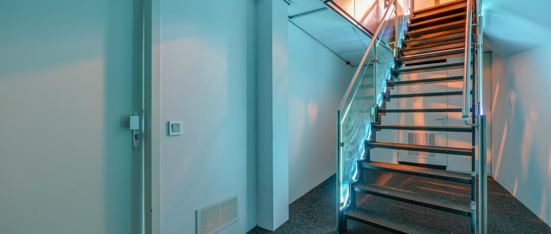 De indeling van de 1e verdieping is in grote lijnen hetzelfde als de begane grond, met uitzondering van enkele glazen scheidingswanden.