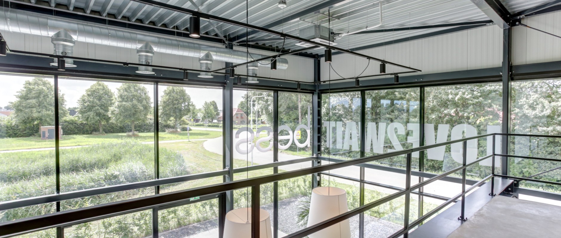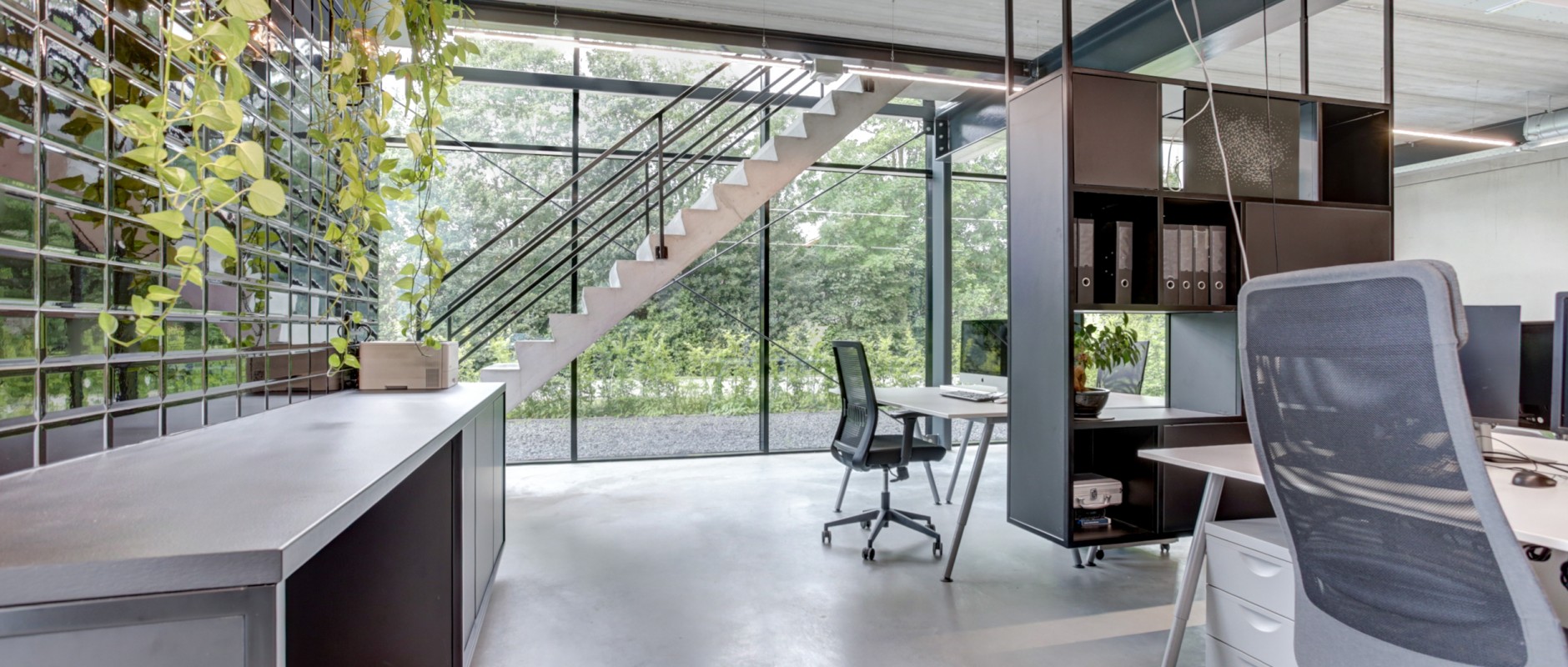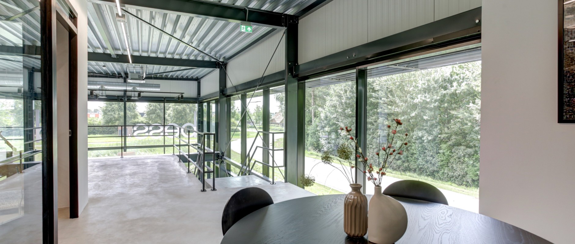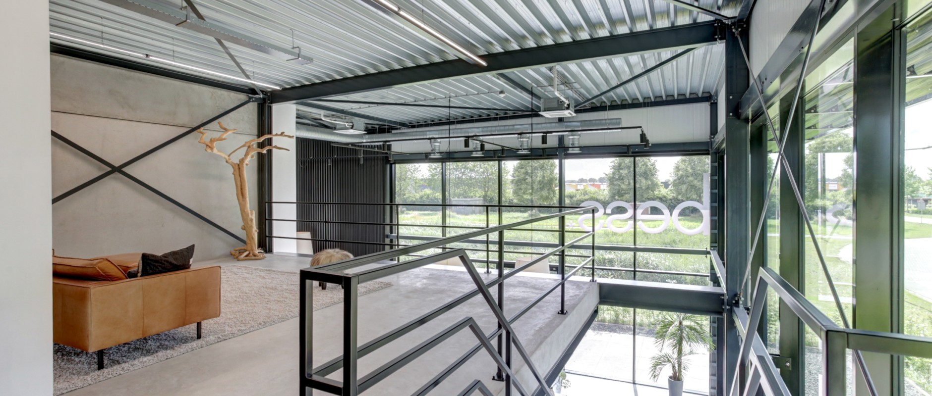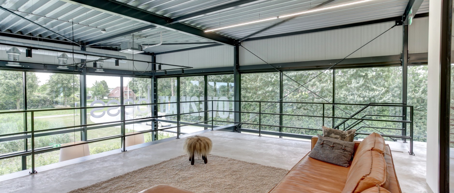 Lees verderDe etage in de kantoorruimte geeft mede door de vide en glaspanelen een mooie vrij uitzicht op de werkruimte en achtergelegen groen.
