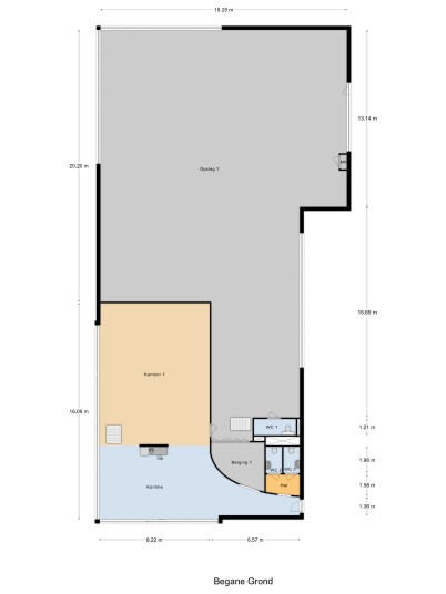 De bedrijfshal heeft een bruto vloeroppervlak van ca. 738,6m² verdeeld over 2 verdiepingen. Op de begane grond biedt de hal met hoogte ca. 405,8m² bedrijfsruimte welke aan de voorzijde van het pand gesitueerd is. De lichte kantoorruimte is verdeeld over 2 verdiepingen en voorzien van een luxe pantry, toiletgroep, betonnen trapopgang en fraaie werkplekken. Een fraaie glaspartij geeft veel licht en toegang tot het ruime terras tegen de achtergevel.