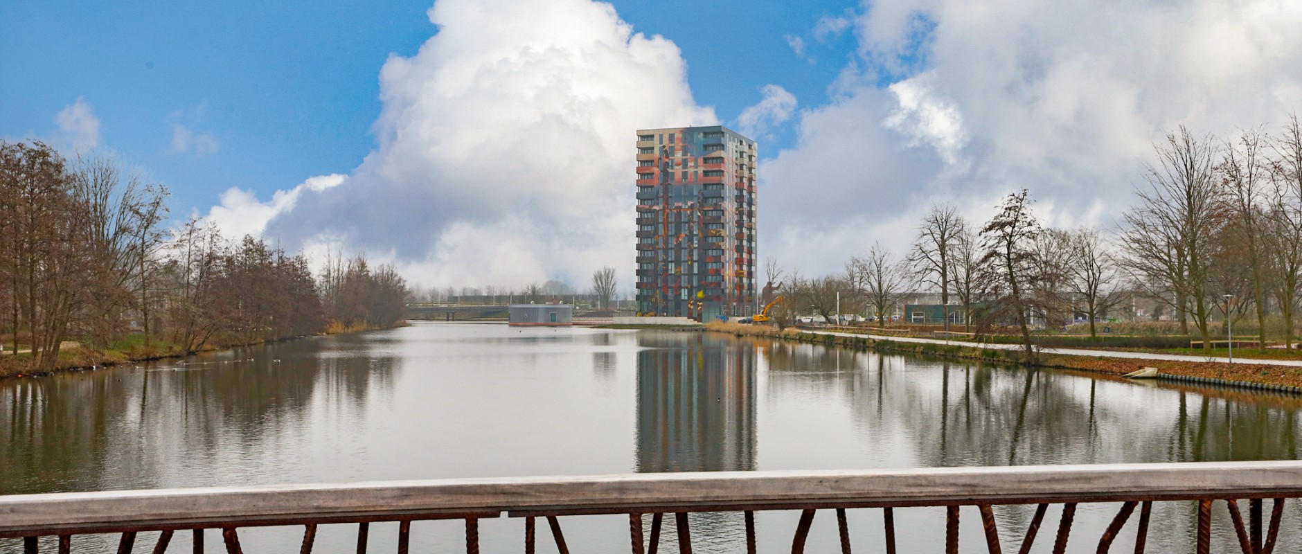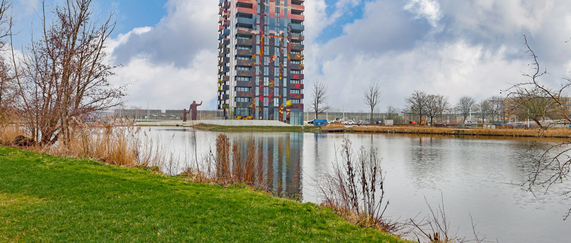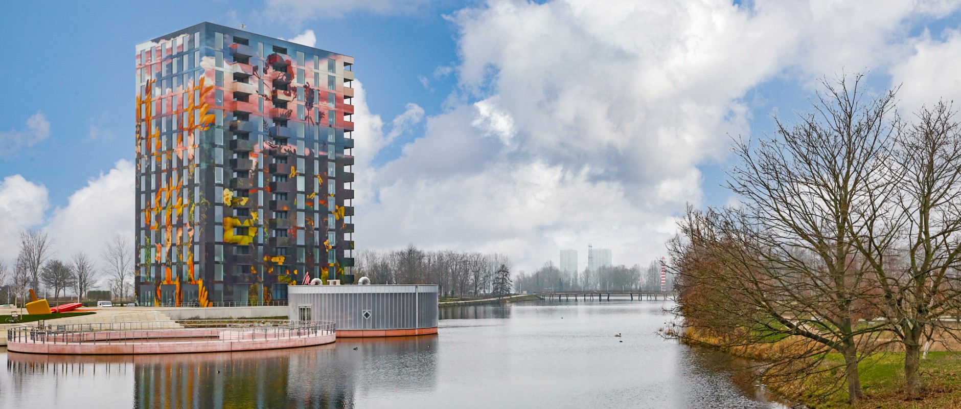 De commerciële ruimte ligt op de begane grond van de woontoren Flores op het voormalig Floriade terrein en is omgeven door water en kunstmuseum M.