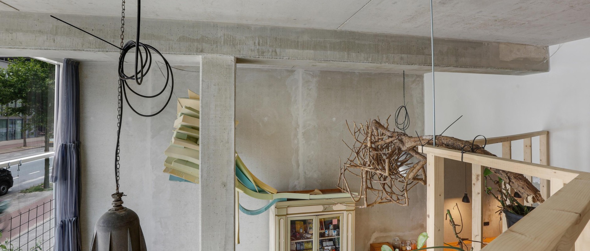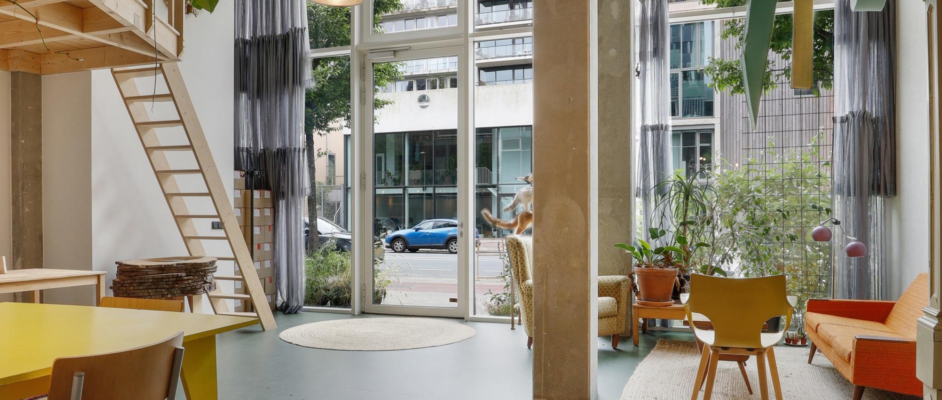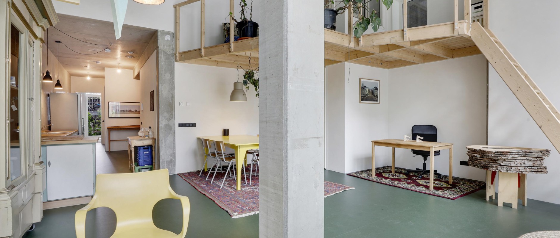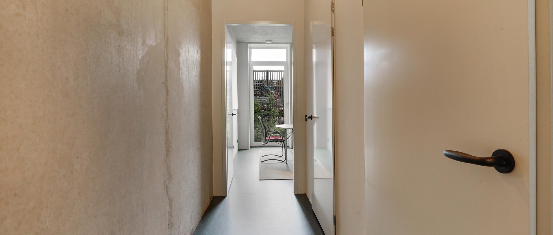 Lees verderAan de straatkant (met zeer brede stoep) valt het licht uitbundig binnen. De entree valt op door de vrije hoogte en de imposante betonnen wand die helemaal vrij tot achter doorloopt. Halverwege hangt een speels entresol. Aan de achterzijde, uitkijkend over de binnentuin, bevind zich een geluid geïsoleerde vergaderruimte en een werkruimte. Tenslotte is er een toilet, een technische ruimte en een opbergruimte. Met de VvE wordt de lobby gedeeld, met hoog plafond en doorkijk van straat naar tuin. Daarnaast is boven de gezamenlijke parkeergarage een groot dek gerealiseerd, dat is ingericht als gemeenschappelijk terras.