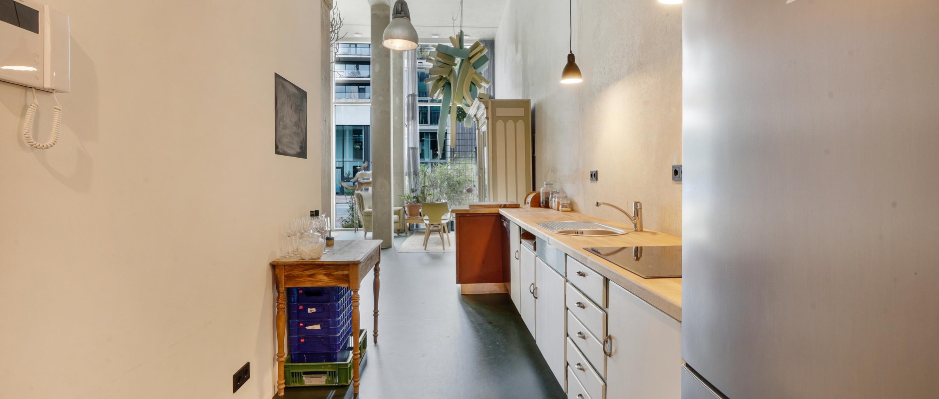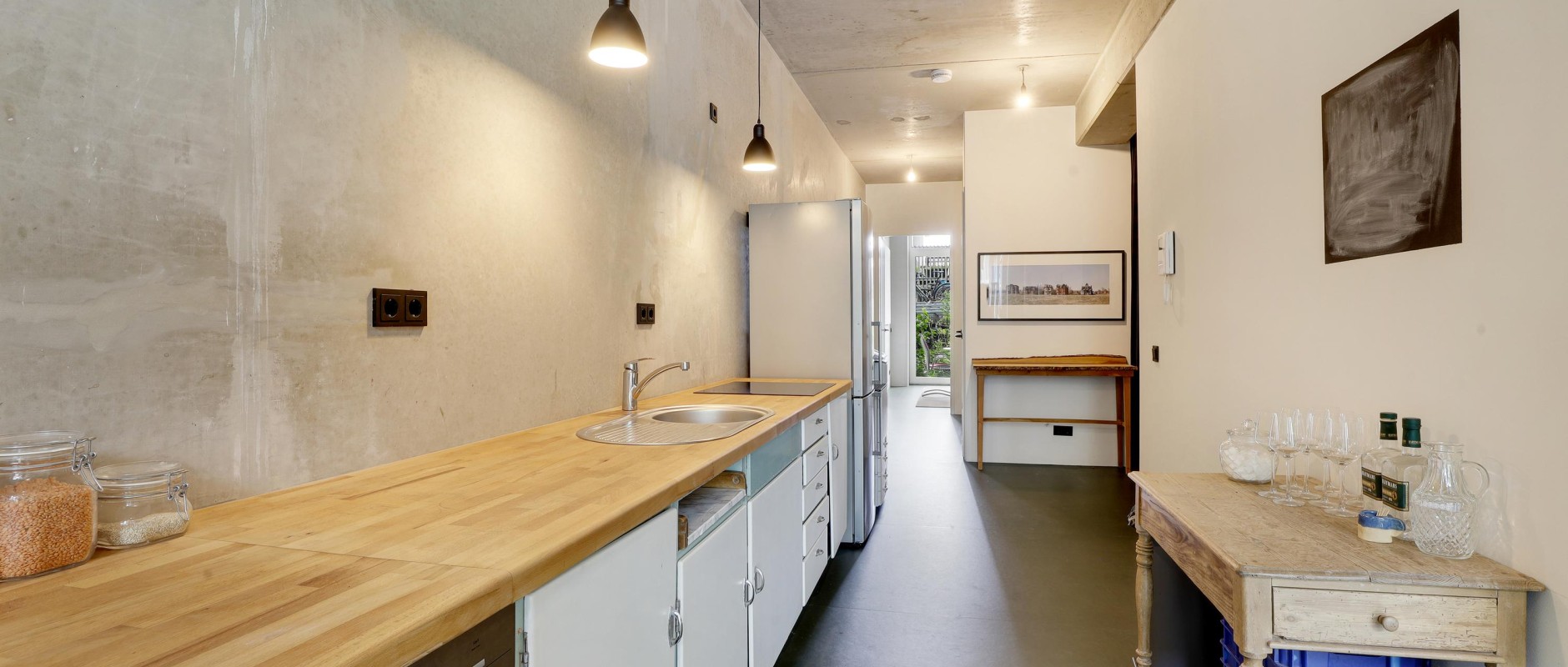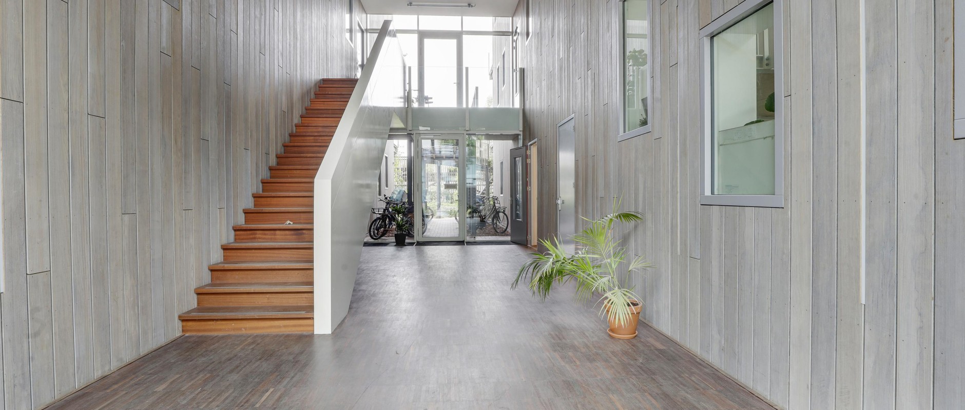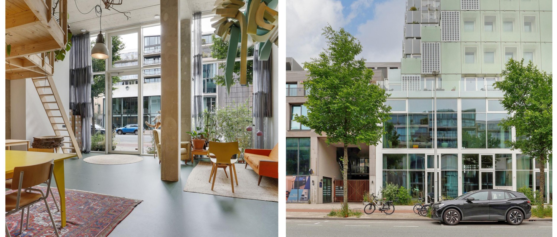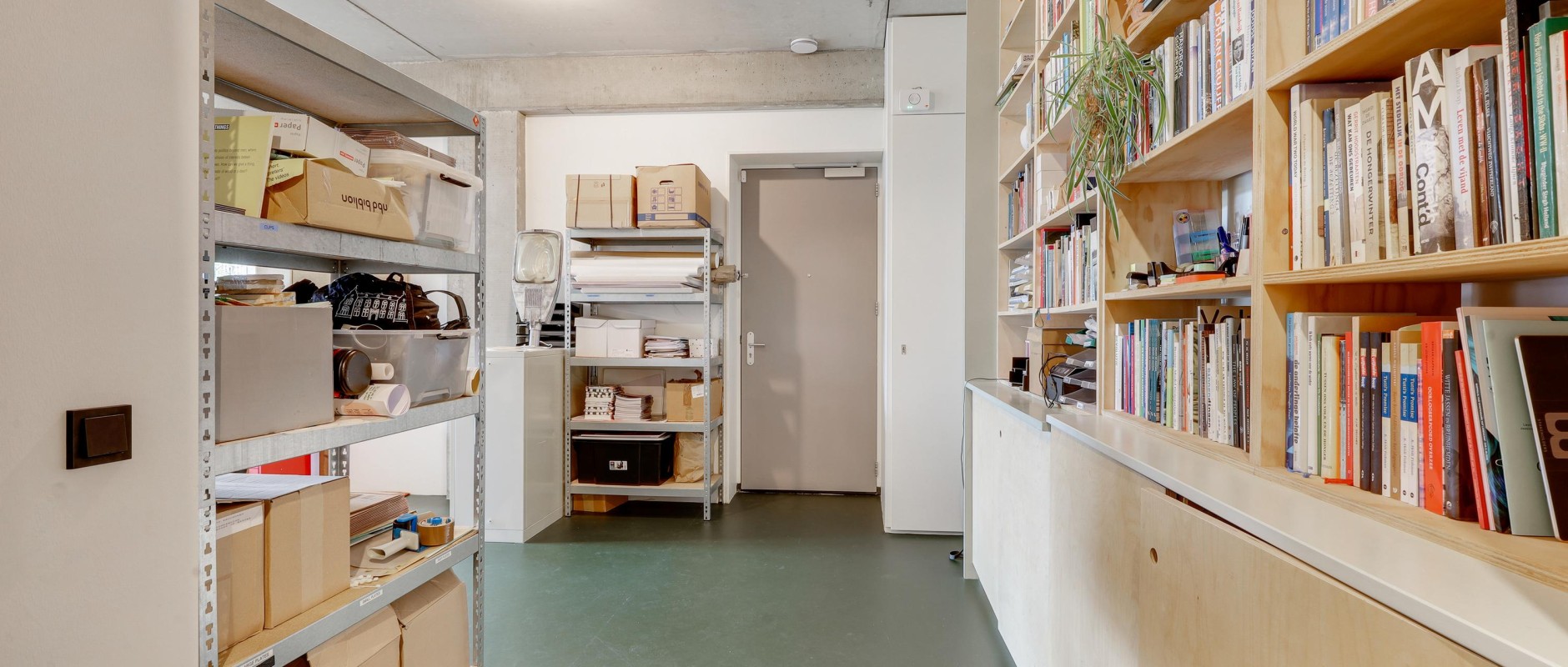 Lees verderAan de straatkant (met zeer brede stoep) valt het licht uitbundig binnen. De entree valt op door de vrije hoogte en de imposante betonnen wand die helemaal vrij tot achter doorloopt. Halverwege hangt een speels entresol. Aan de achterzijde, uitkijkend over de binnentuin, bevind zich een geluid geïsoleerde vergaderruimte en een werkruimte. Tenslotte is er een toilet, een technische ruimte en een opbergruimte. Met de VvE wordt de lobby gedeeld, met hoog plafond en doorkijk van straat naar tuin. Daarnaast is boven de gezamenlijke parkeergarage een groot dek gerealiseerd, dat is ingericht als gemeenschappelijk terras.