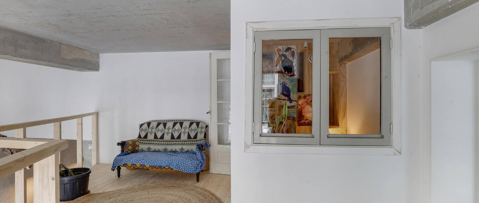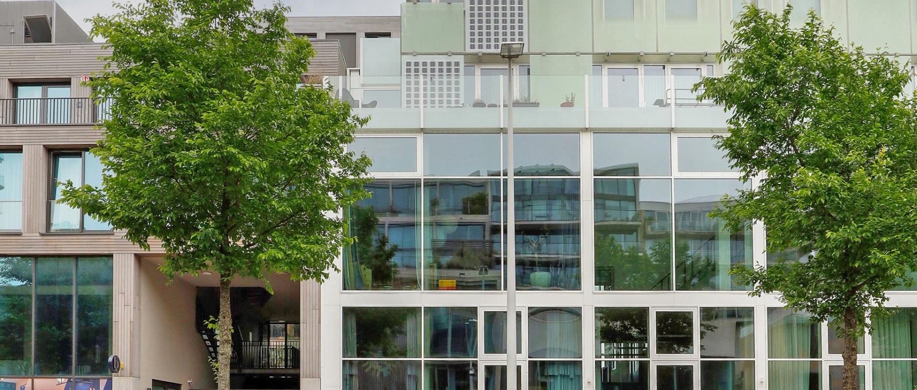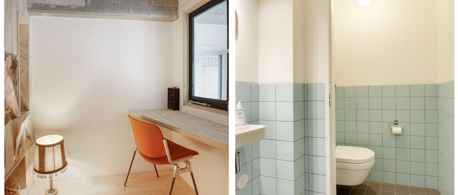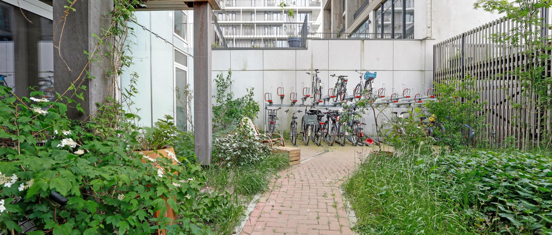 Lees verderAan de straatkant (met zeer brede stoep) valt het licht uitbundig binnen. De entree valt op door de vrije hoogte en de imposante betonnen wand die helemaal vrij tot achter doorloopt. Halverwege hangt een speels entresol. Aan de achterzijde, uitkijkend over de binnentuin, bevind zich een geluid geïsoleerde vergaderruimte en een werkruimte. Tenslotte is er een toilet, een technische ruimte en een opbergruimte. Met de VvE wordt de lobby gedeeld, met hoog plafond en doorkijk van straat naar tuin. Daarnaast is boven de gezamenlijke parkeergarage een groot dek gerealiseerd, dat is ingericht als gemeenschappelijk terras.