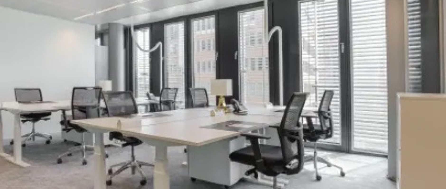 - Vloerbedekking en ingerichte werkplekken (bureaus, stoelen, kasten).