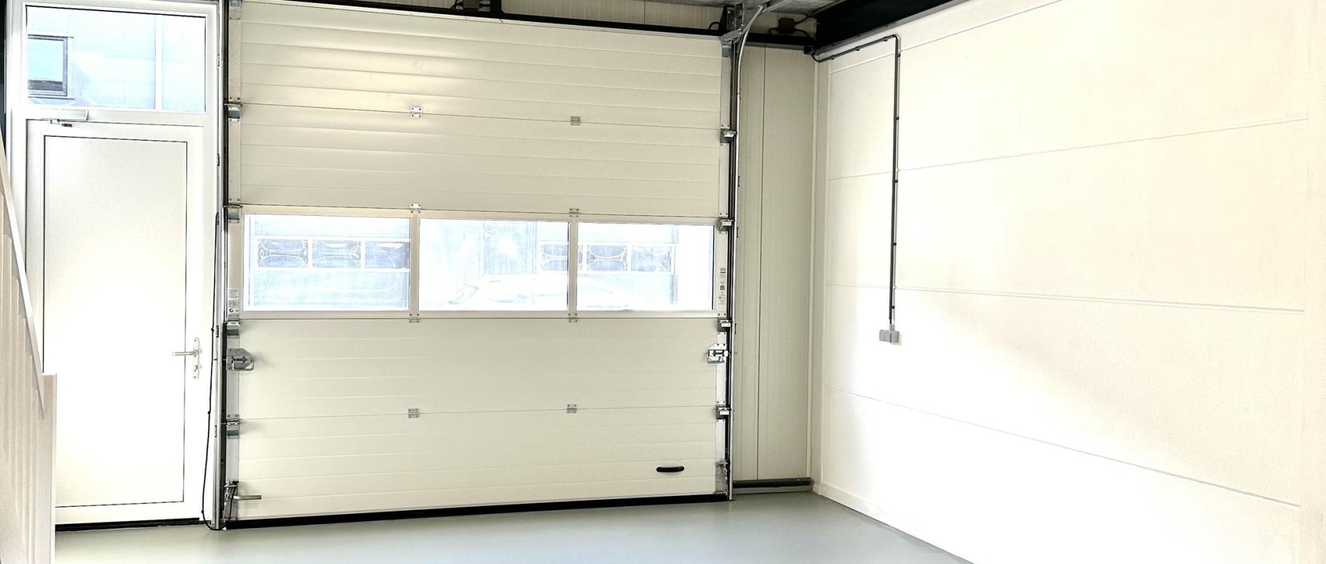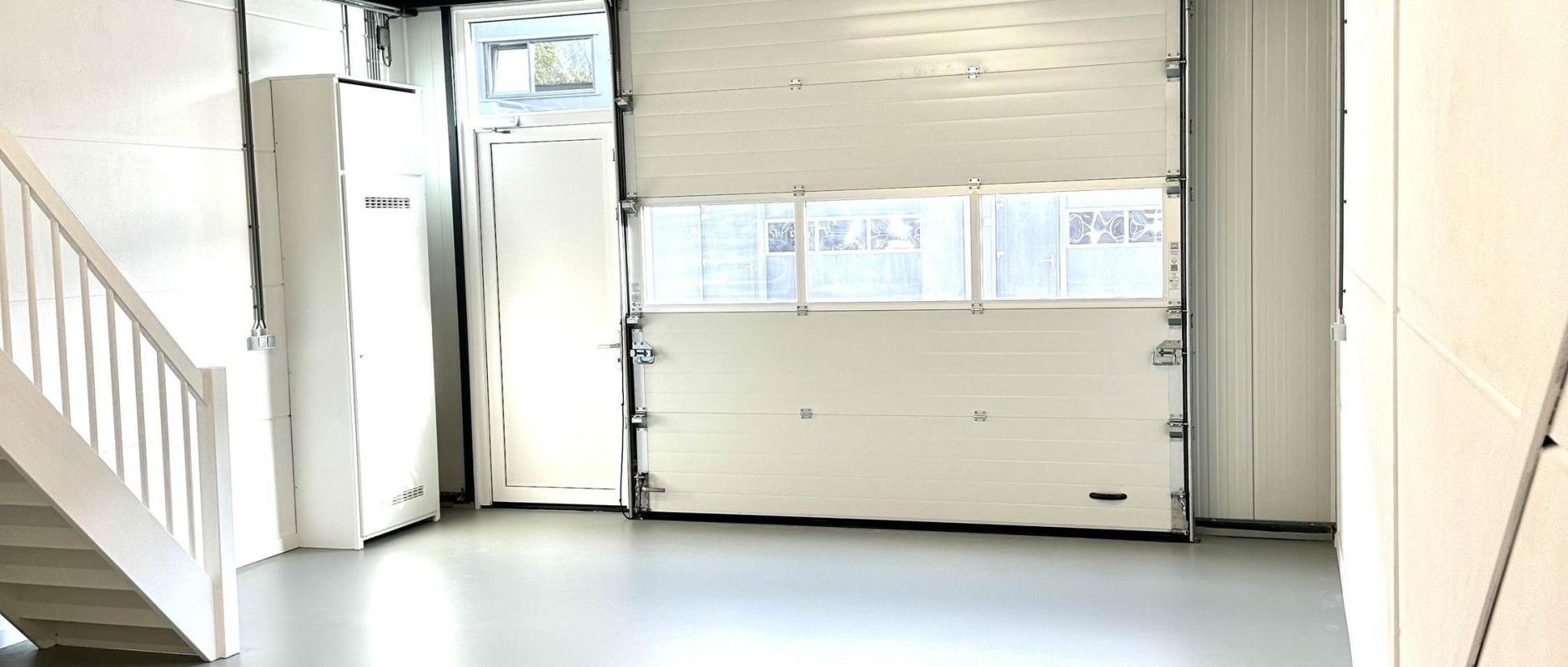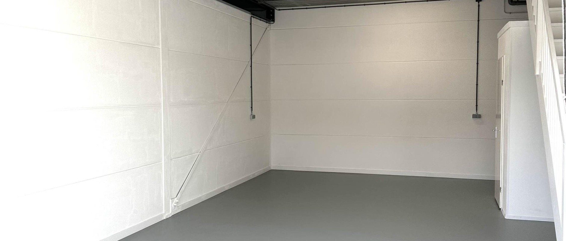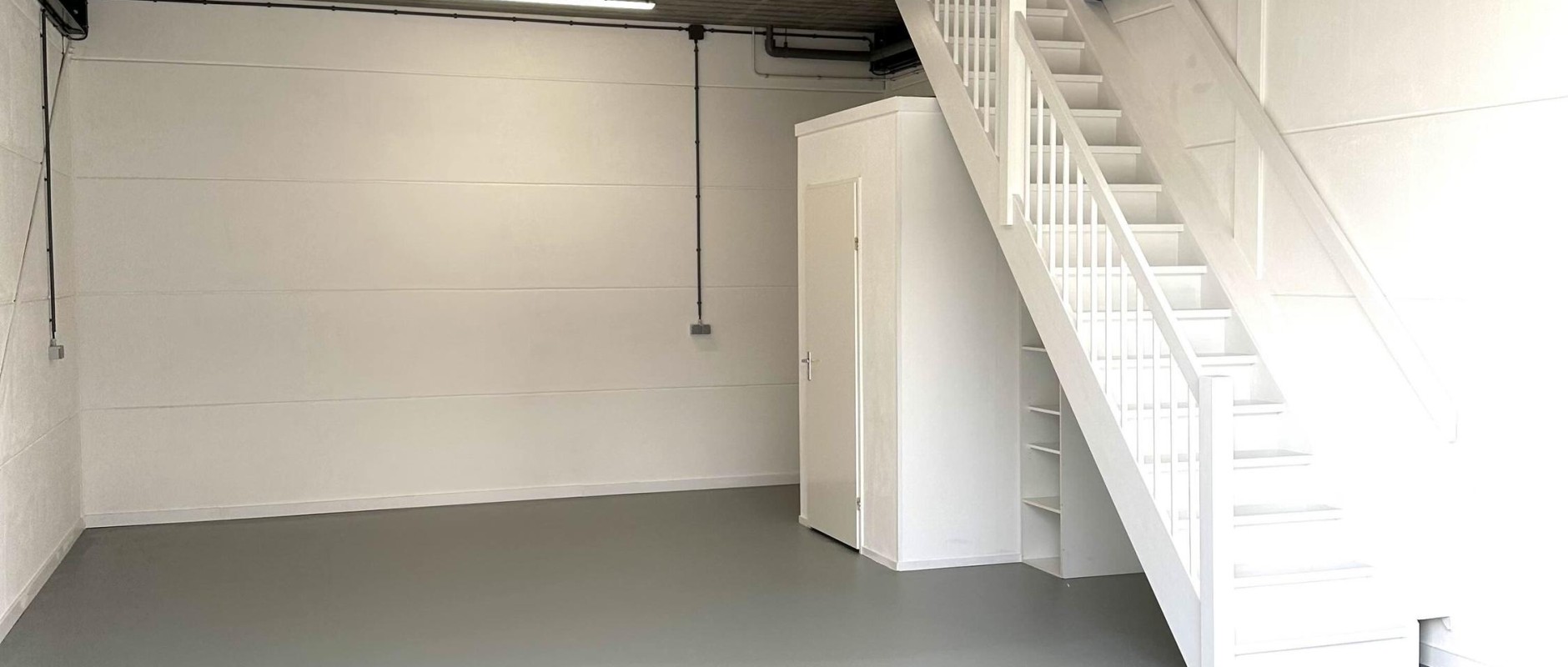 De bedrijfsruimte is toegankelijk middels een overheaddeur (3,2m x 3,2m) en een separate loopdeur. Er is op de begane grond een vloeistofdichte betonvloer alsmede een toiletruimte aanwezig. De kantoorruimte op de verdieping is vanuit de hal met een dichte trapopgang bereikbaar.