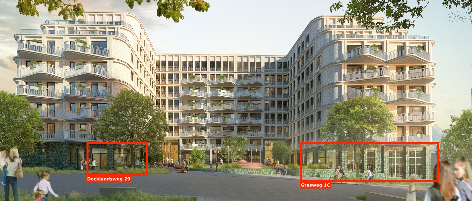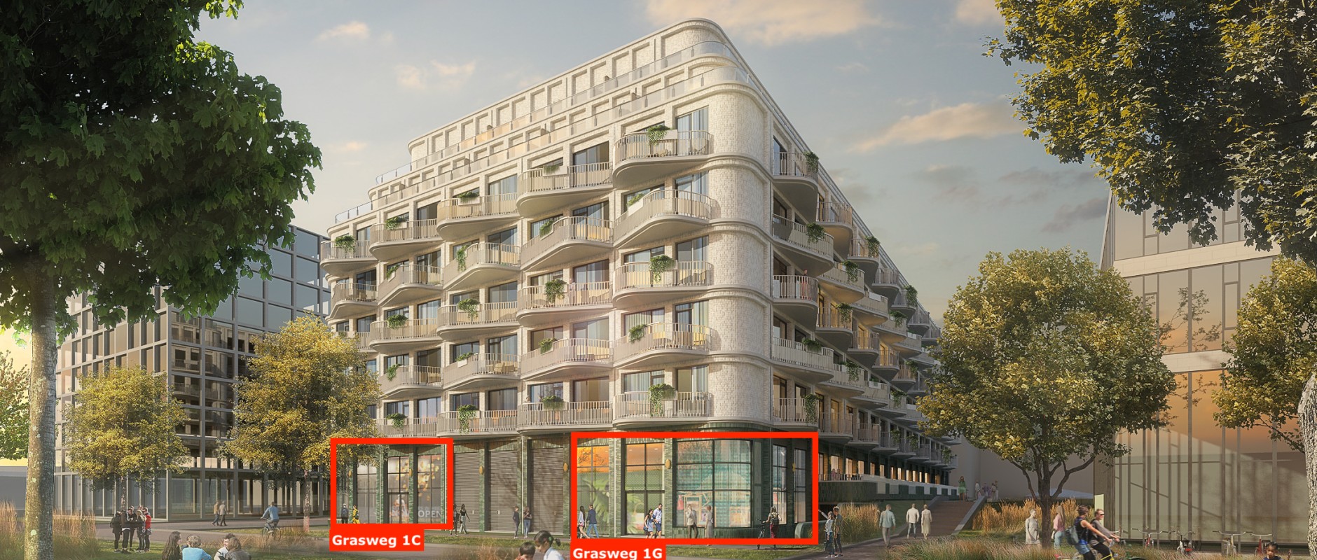 In de stadswijk Aan het IJ kun je wonen, ontspannen en ondernemen. De nieuwe wijk ligt tussen het IJ en de Van der Pekbuurt in Amsterdam-Noord, vlak achter EYE Filmmuseum en het Schegpark. Op de Grasweg komen diverse commerciële ruimten. De Docklandsweg, waar nu ook al diverse bedrijven gevestigd zijn zoals o.a. een wijnbar, een sushi restaurant en supermarkt Odin, liggen om de hoek en dat maakt deze ruimte nóg aantrekkelijker.