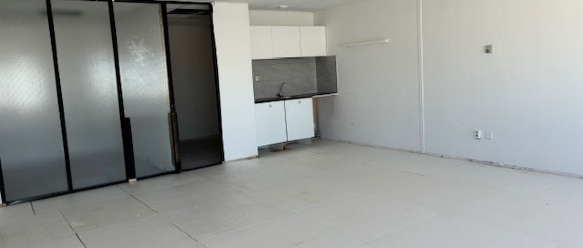 Kantoorgedeelte opgedeeld in 3 ruimtes met een eenvoudig keukenblok en c.v.-combiketel.