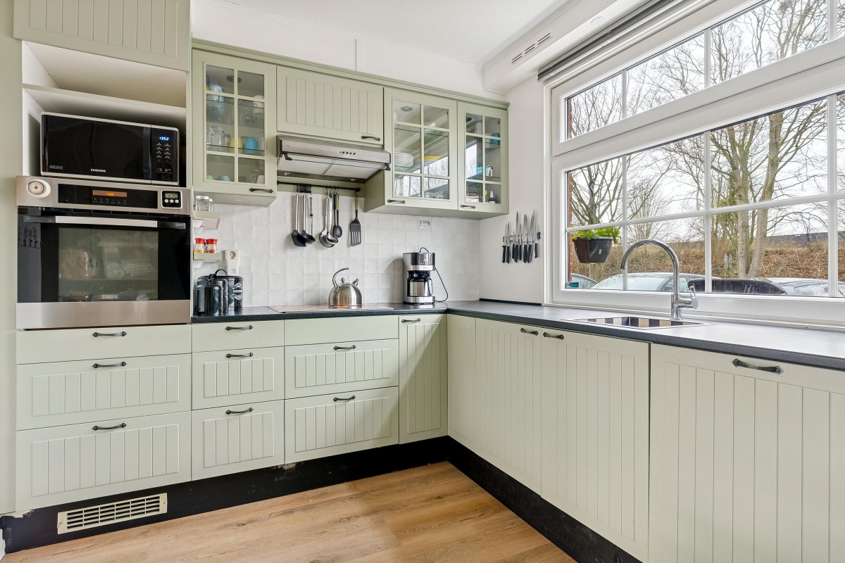 The spacious living room is located at the rear of the house and offers views of the cozy garden. Thanks to the large windows, plenty of natural light floods the space, creating a bright and airy atmosphere. The open kitchen at the front of the house is efficiently designed, offering ample work and storage space.