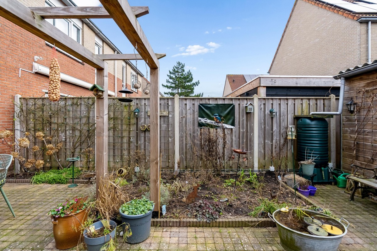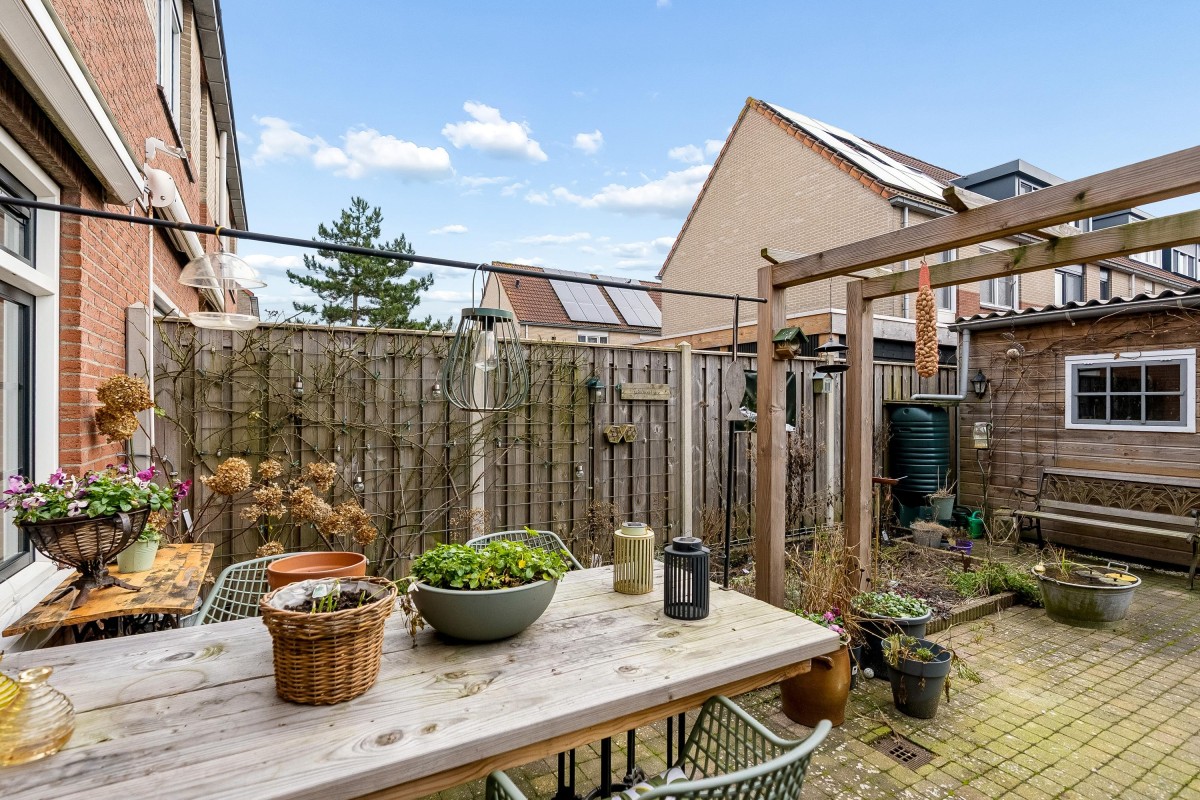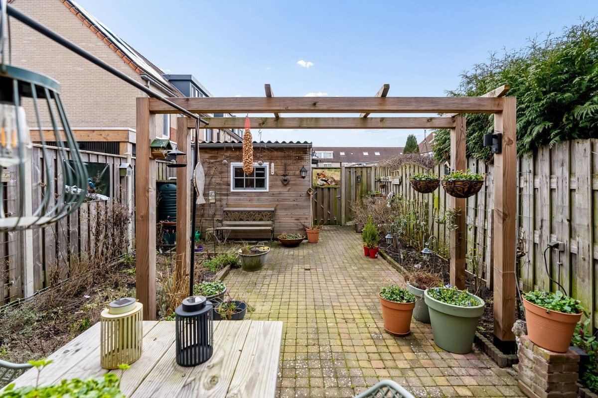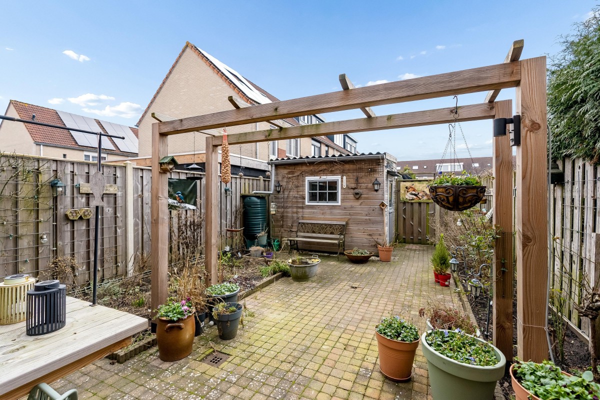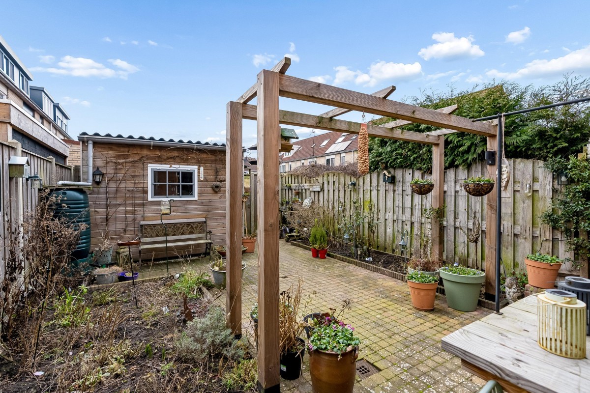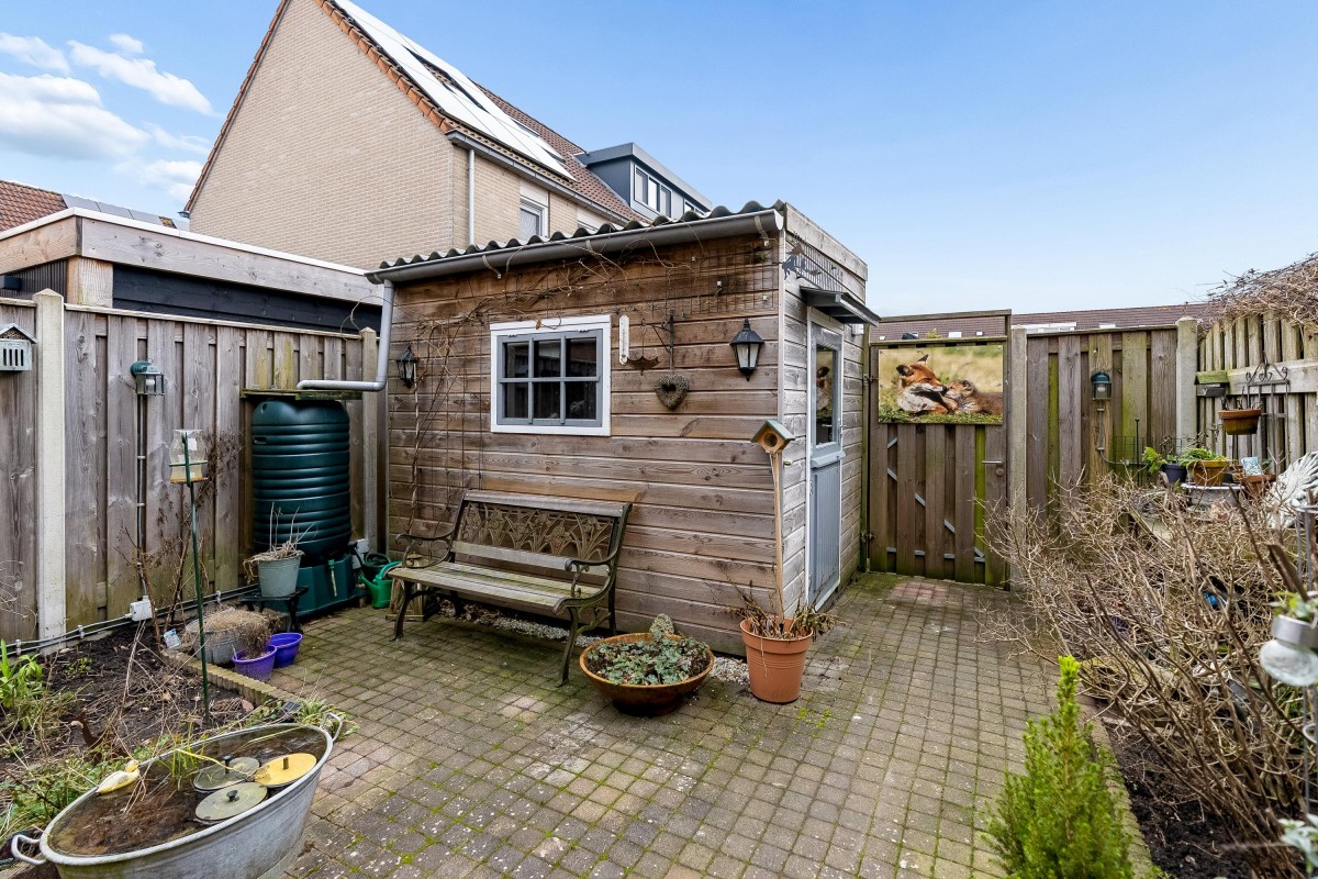 From the living room, you have access to the sunny backyard via French doors. The garden faces south, allowing you to enjoy the sun all day long. At the back of the garden, there’s a practical wooden shed, ideal for storing bicycles or garden tools. The garden also has a back entrance, providing easy access to the rear of the property.