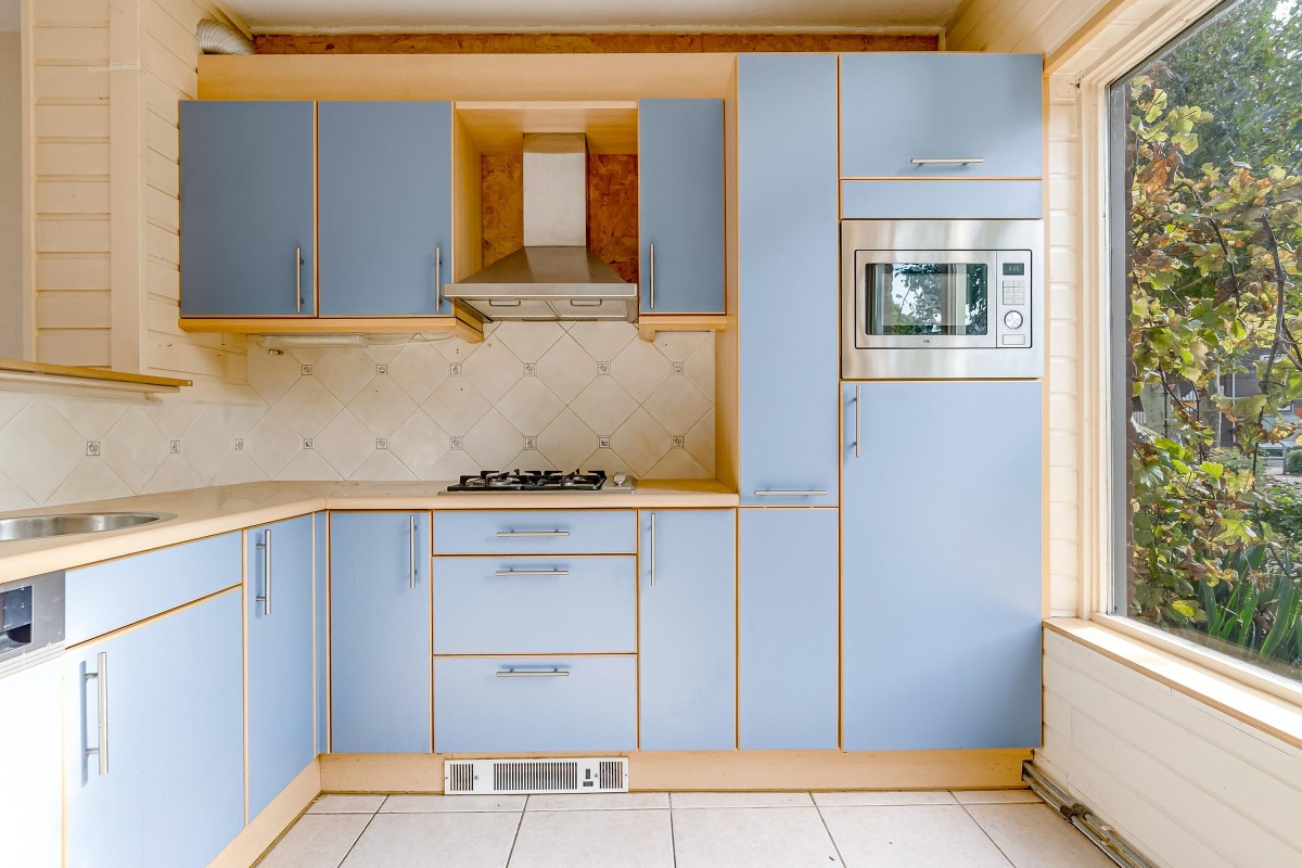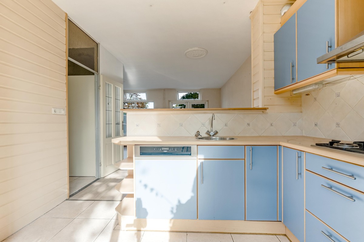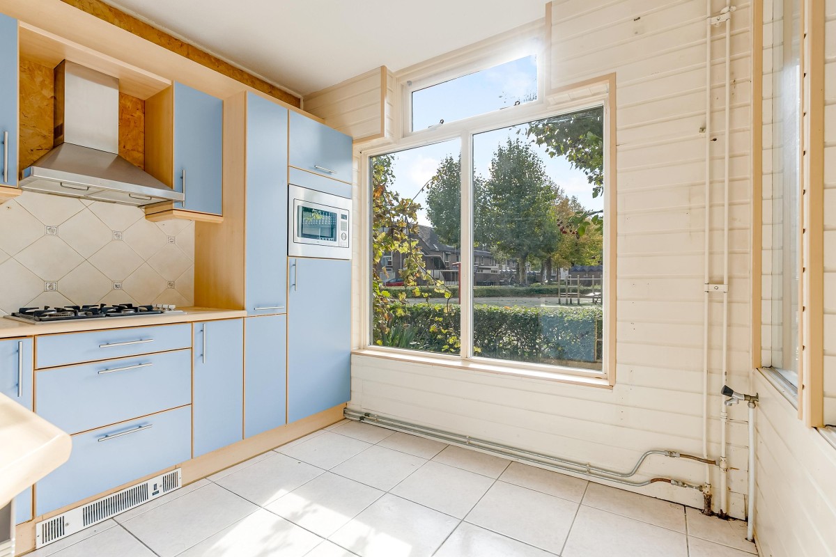 The semi-open kitchen is located at the front of the house and offers a view of the street and the playground. The kitchen is functional but can be replaced according to your own taste.
