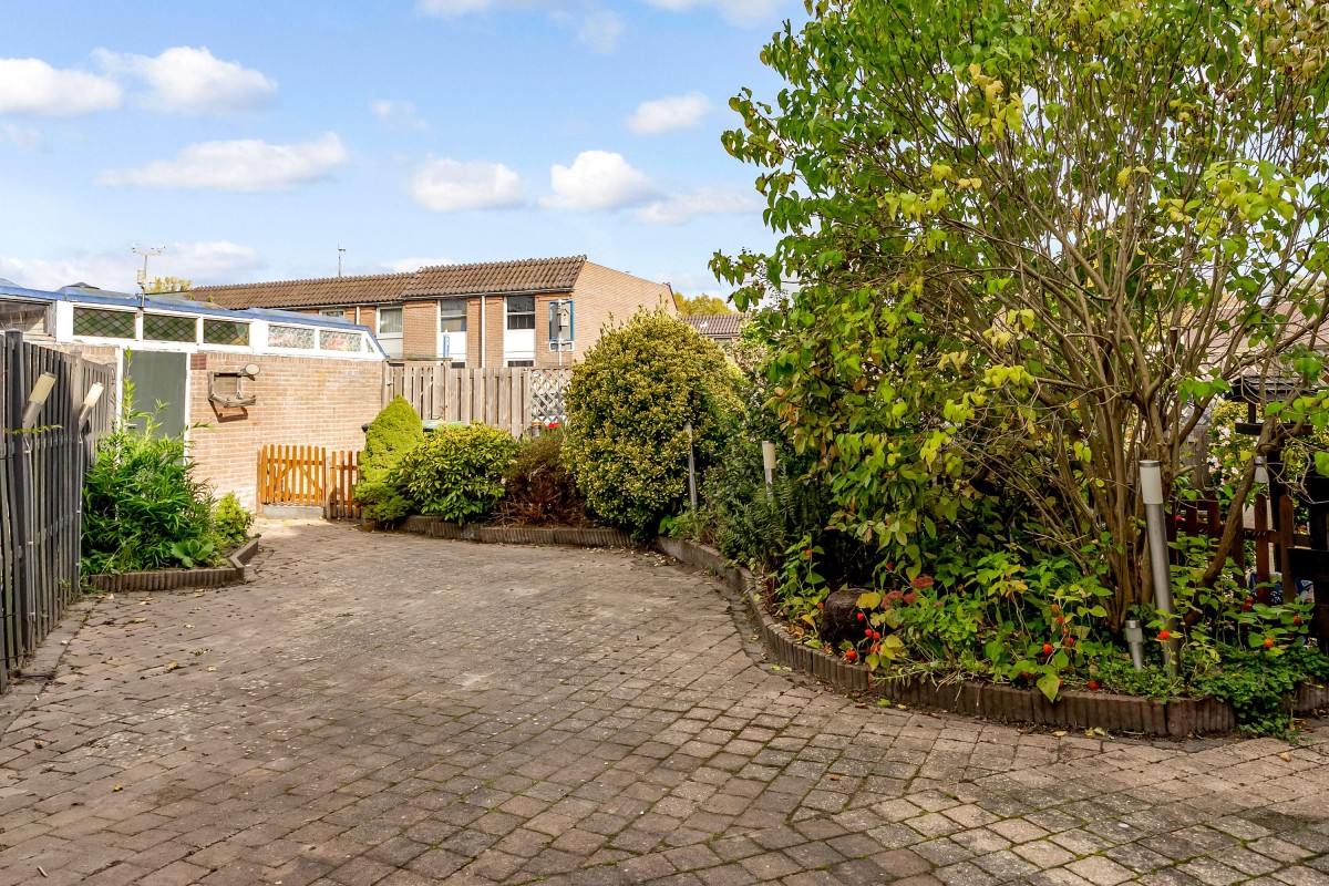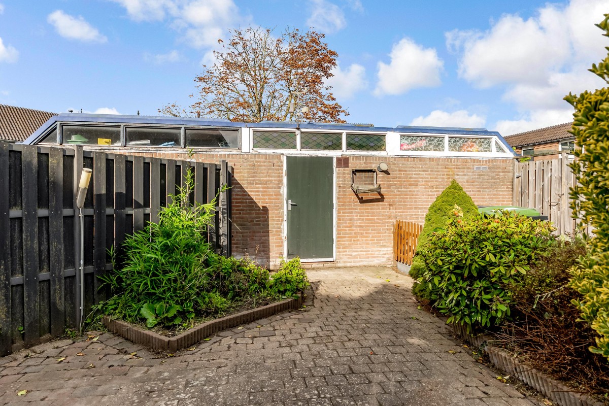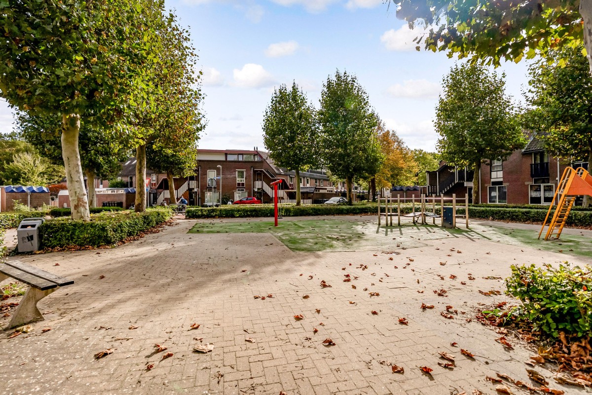 At the back of the garden, there is a detached stone shed with electricity, perfect for storing bikes and garden tools. Through a back gate, there is access to a quiet courtyard. At the front, you look out over a playground, making the location even more attractive for families.
