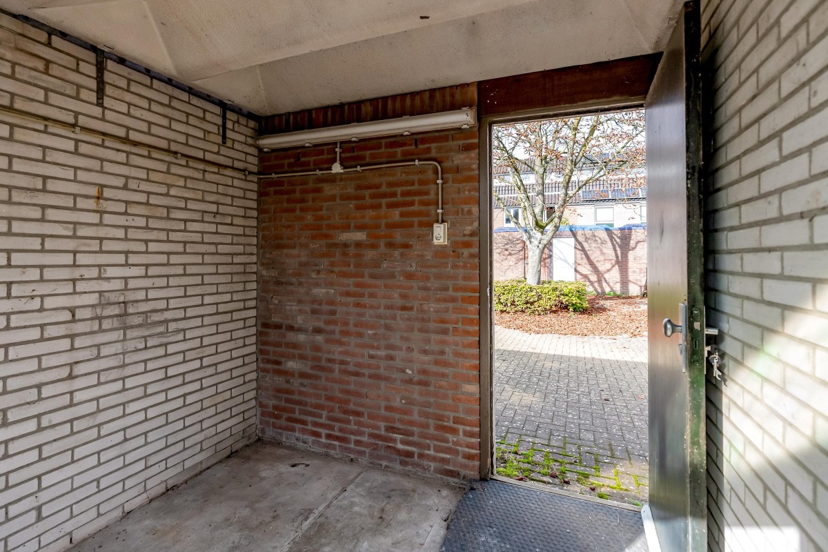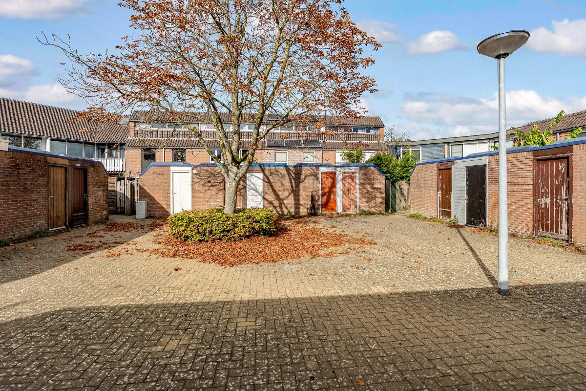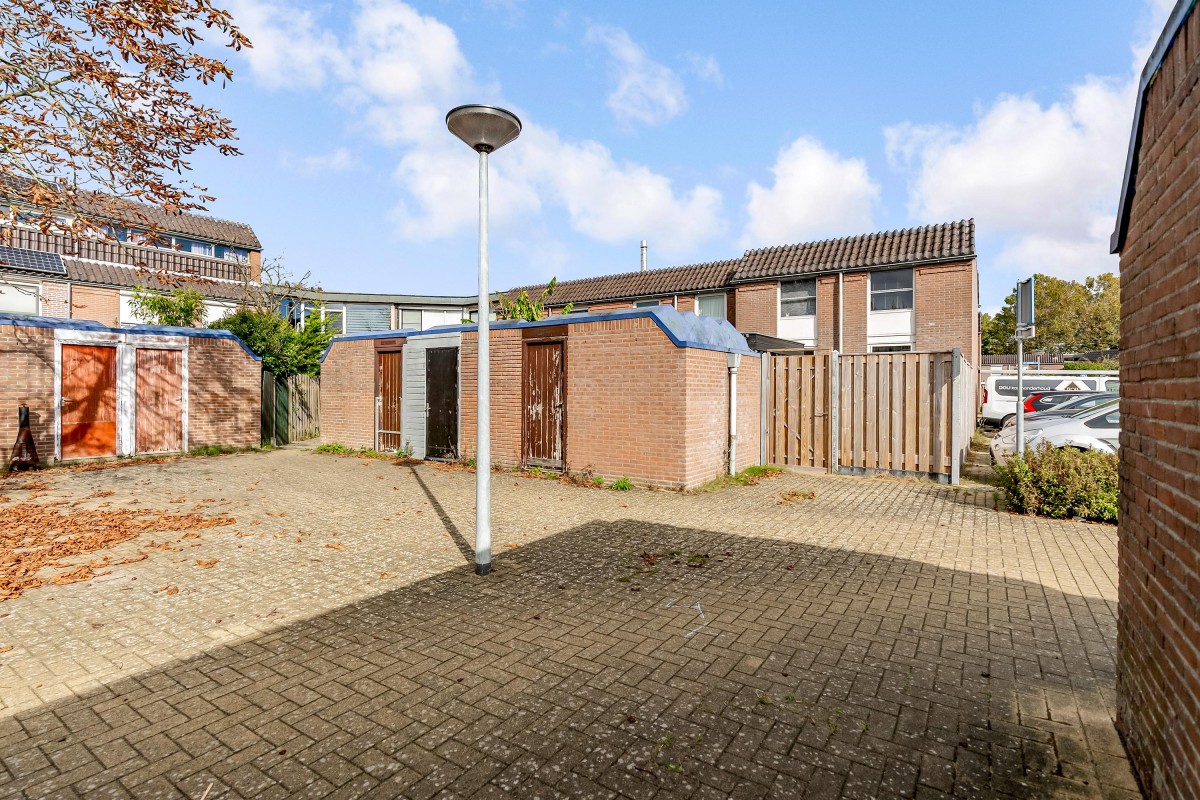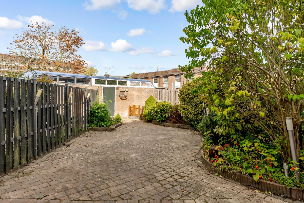 At the back of the garden, there is a detached stone shed with electricity, perfect for storing bikes and garden tools. Through a back gate, there is access to a quiet courtyard. At the front, you look out over a playground, making the location even more attractive for families.
