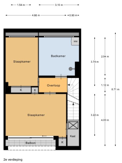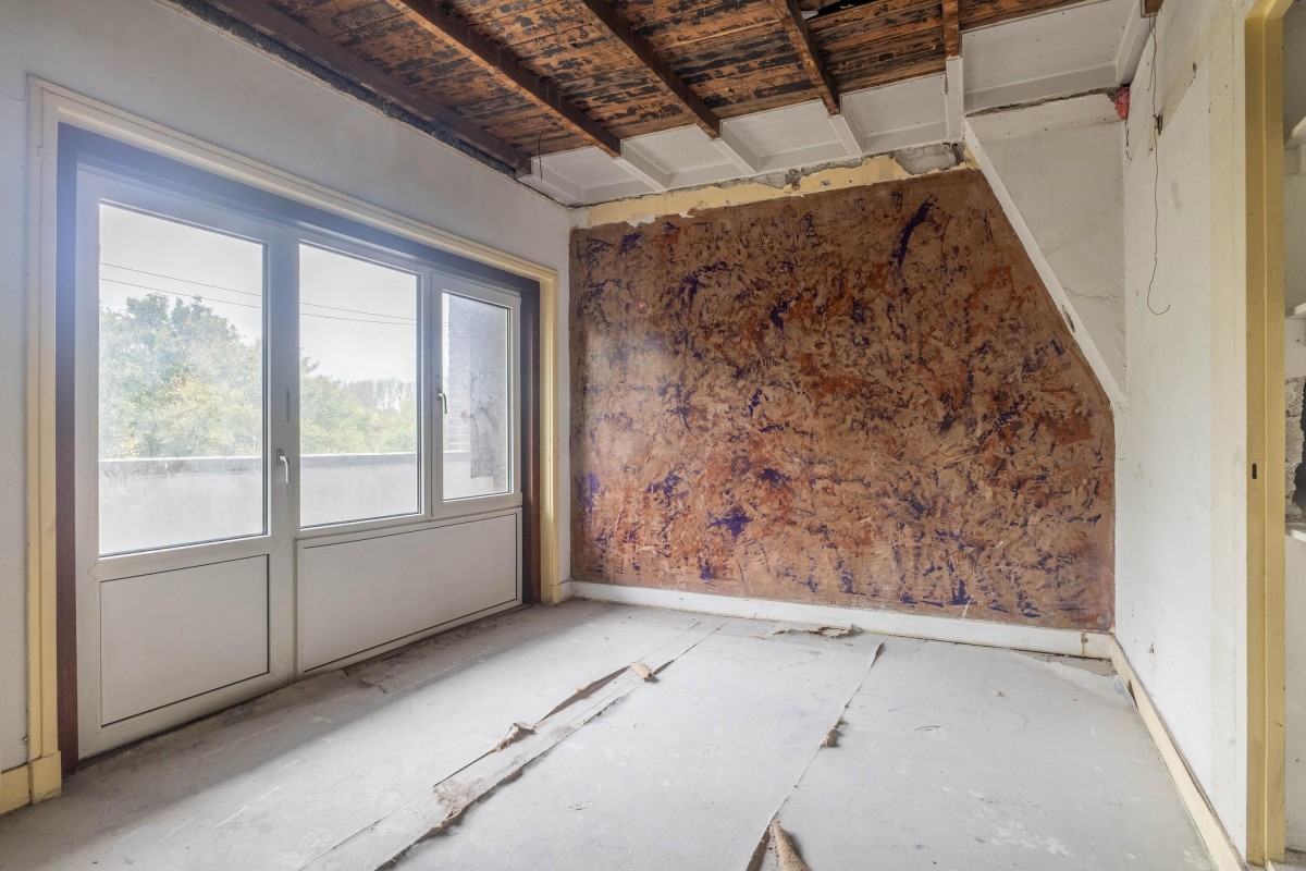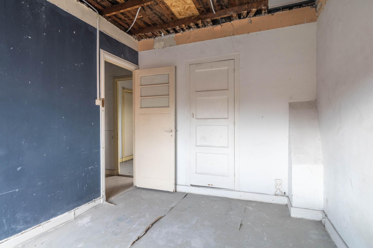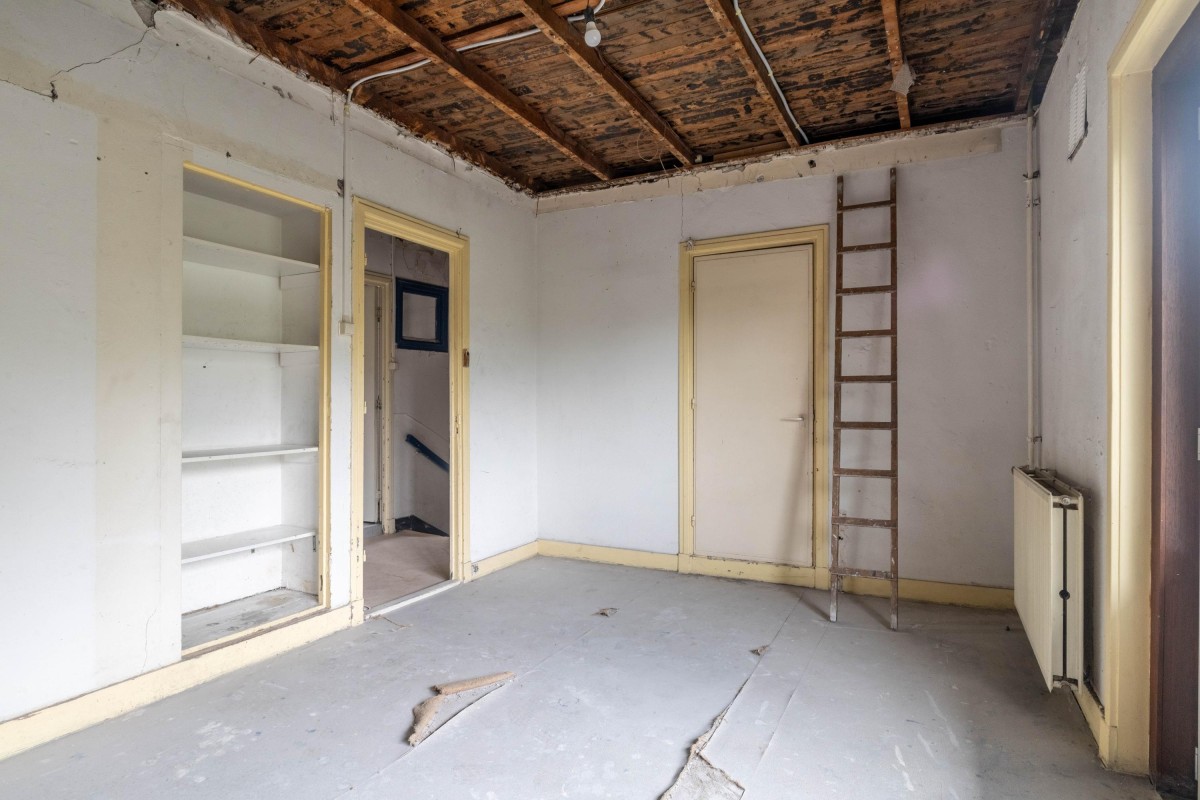 The landing on the second floor provides access to the bathroom and two bedrooms. The first bedroom is located at the rear, as is the shell bathroom, which includes a shower and washing machine connection. The second bedroom is at the front and features a balcony and storage closet. From this closet, a ladder provides access to the attic, which is not included in the official property division.