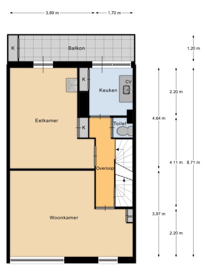Lees verderThis floor also has a separate toilet. A staircase leads to the second floor.