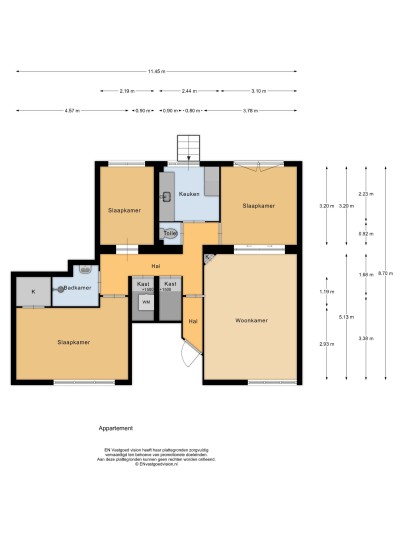 Through the front door, you enter the hallway with access to all rooms. The spacious living room at the front connects to a second en-suite room, which can be used as a dining area or additional bedroom, and features French doors opening to a Juliet balcony. At the rear are the kitchen and a second bedroom; at the front lies the third bedroom with a built-in wardrobe.