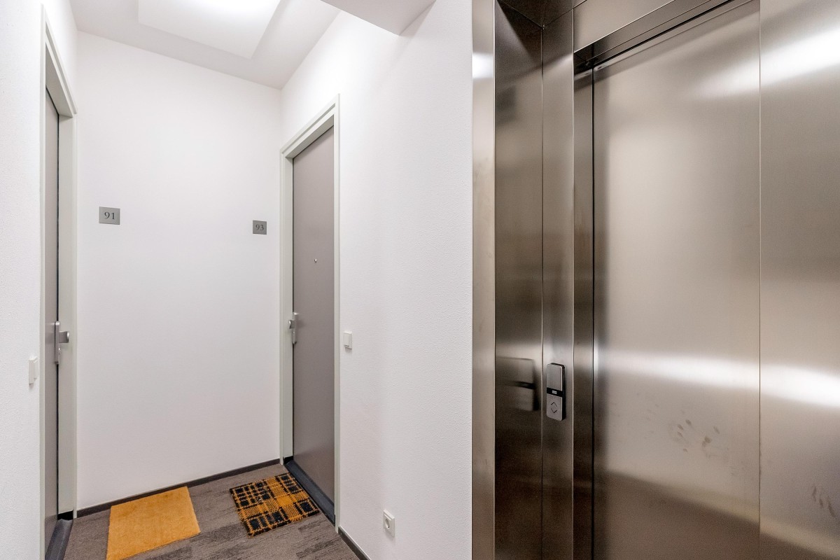 Entree met bellen tableau, centrale entree met lift en trappenhuis. Het appartement heeft een gemeenschappelijk fietsberging tot zijn beschikking.
