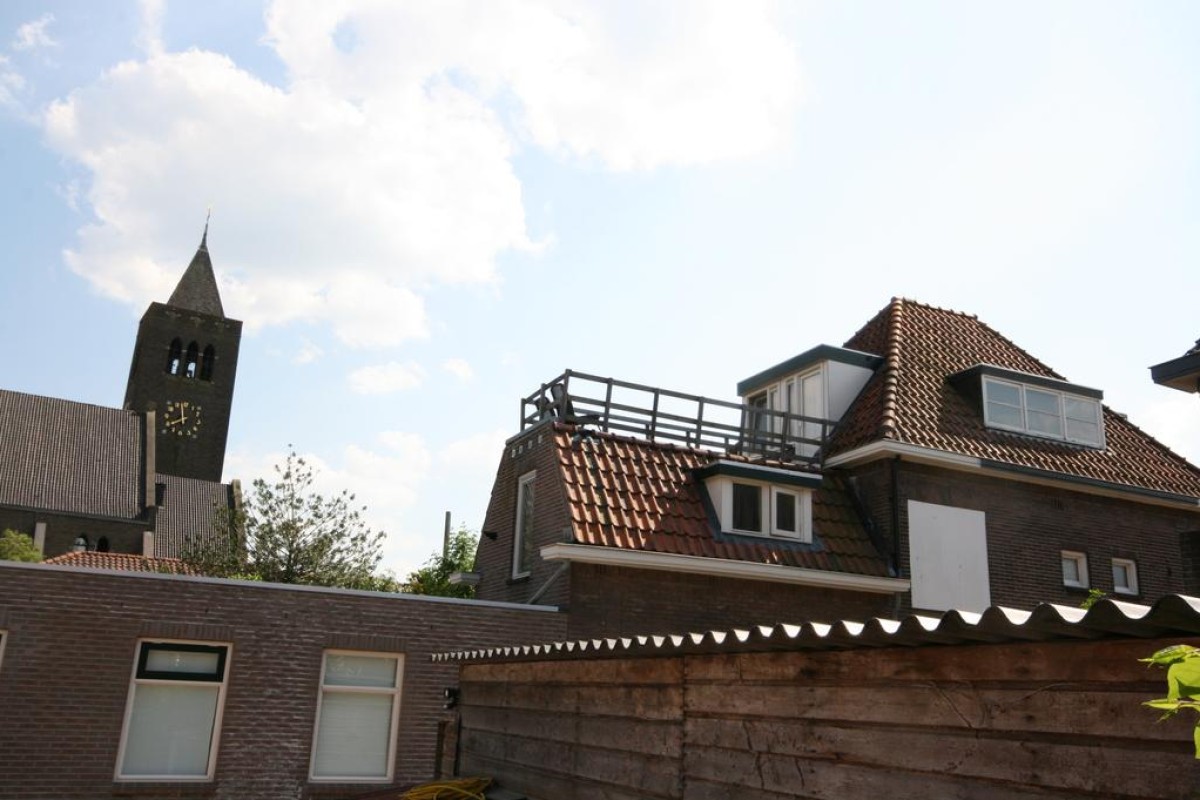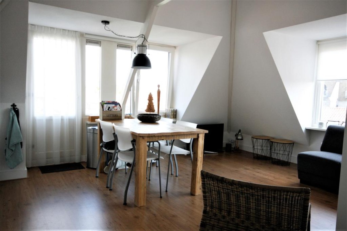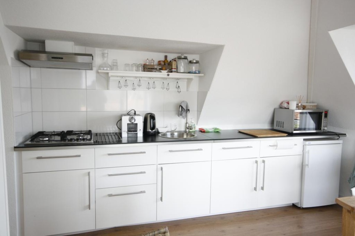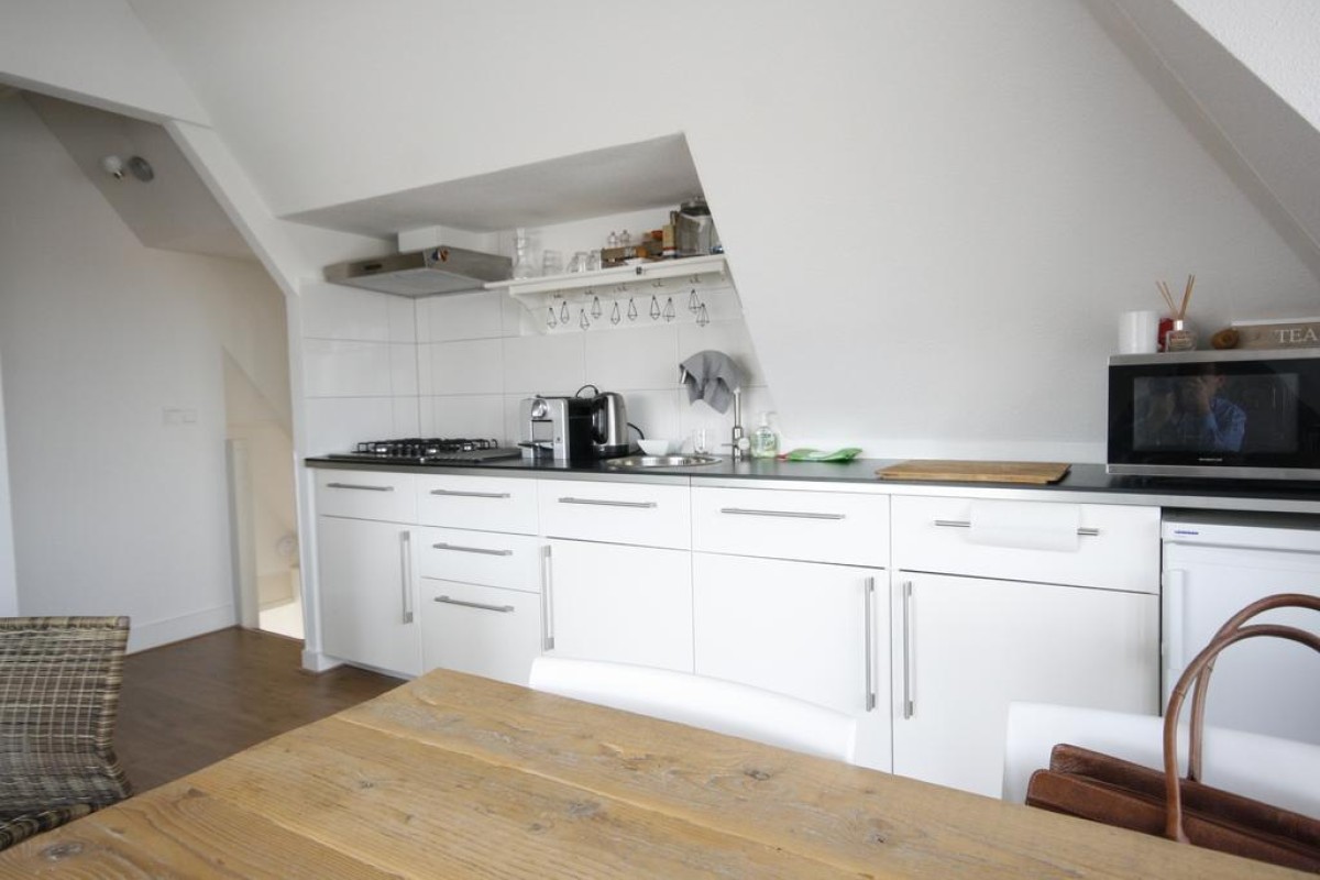 Sfeervolle woonkamer met originele balken en spanten. Ruime keuken. Vanuit de woonkamer heeft u toegang tot eigen dakterras van ca. 2x4 meter welke de gehele dag in de zon is gelegen.