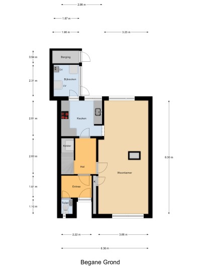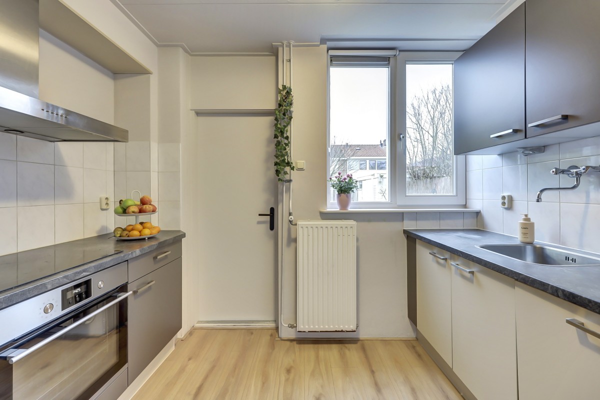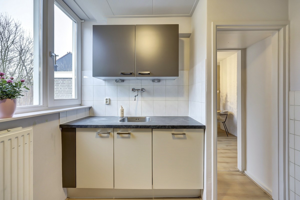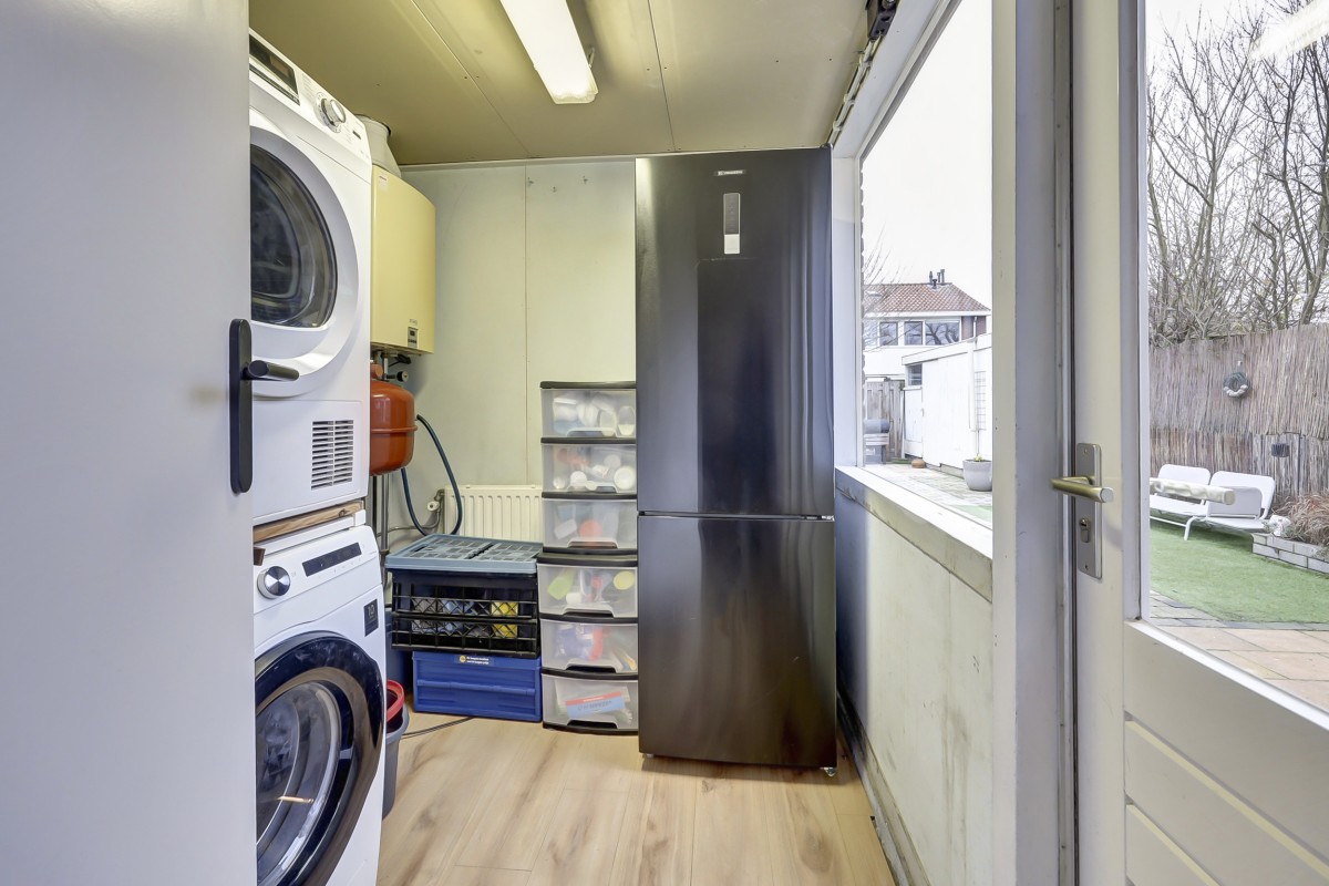 Begane grond: overdekte entree met portaal, doorgang naar de hal met meterkast, toiletruimte met toilet en fonteintje, 2e hal met kelderkast onder de trap en doorgang naar de lichte living met fraai uitzicht op de groen voorziening. Aan de achterzijde van de woning is een gezellige eethoek gesitueerd met aangrenzend een doorgang naar de halfopen keuken voorzien een koelkast, een oven, 4 pits inductiekookplaat en afzuigkap. Doorgang naar aangebouwde bijkeuken waar de wasmachine, droger en Rema HR c.v.-ketel gesitueerd zijn. Vanuit de bijkeuken is de tuin bereikbaar. De tuin is op het westen gelegen en voorzien van een achterom en vrijstaande houten berging en achterom.