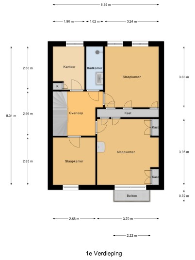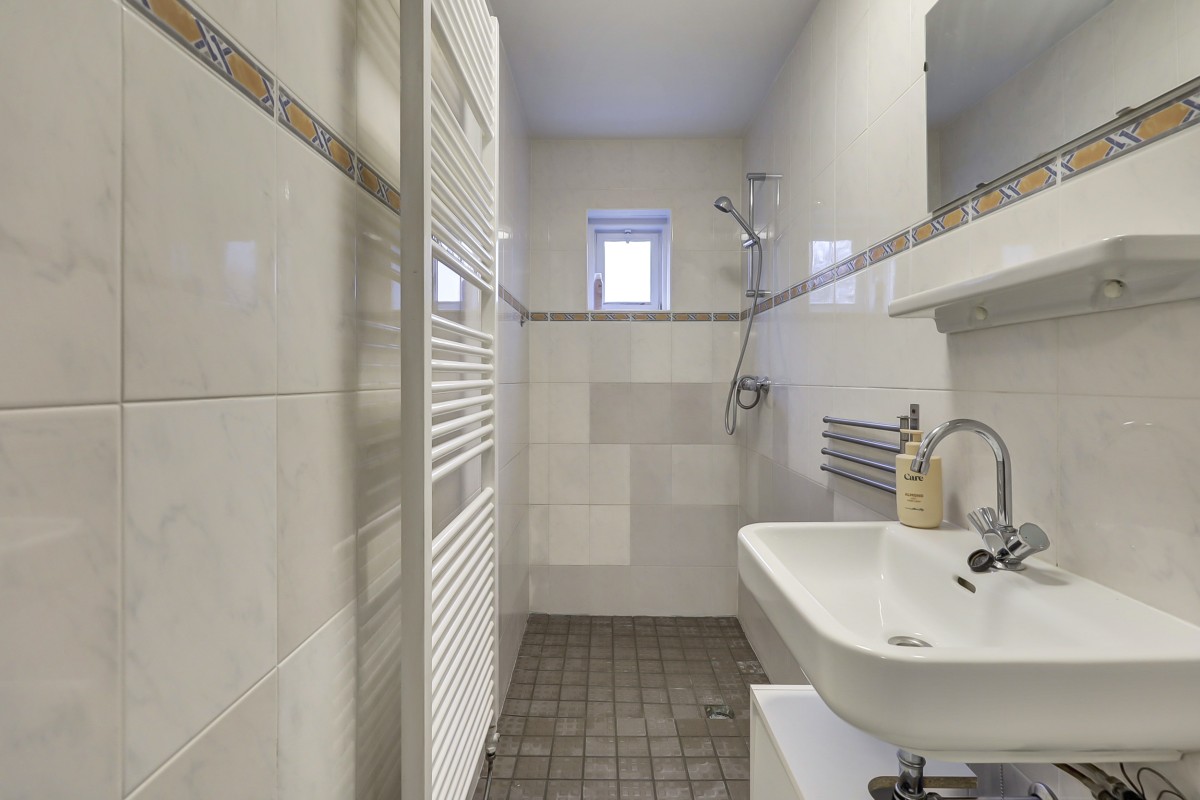 Eerste verdieping: ruime overloop met aangrenzend 4 slaapkamers en de badkamer. De originele badkamer biedt een ruime inloopdouche met wastafel en designradiator. Twee slaapkamers beschikken over een grote vaste kastenwand en de ouderslaapkamer aan de voorzijde van de woning beschikt over een balkon voor de heerlijke ochtendzon op het oosten. De overloop en slaapkamers zijn voorzien van een laminaatvloer.