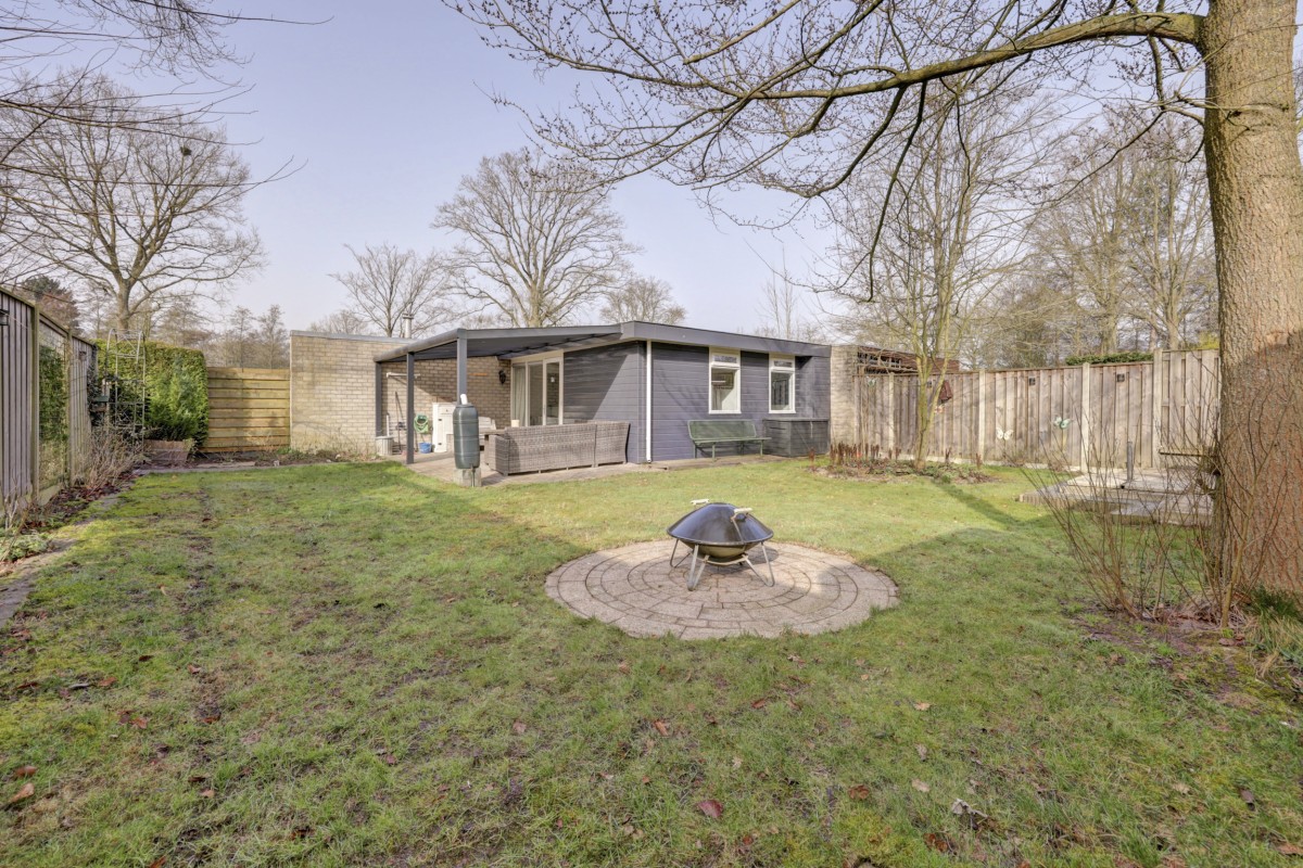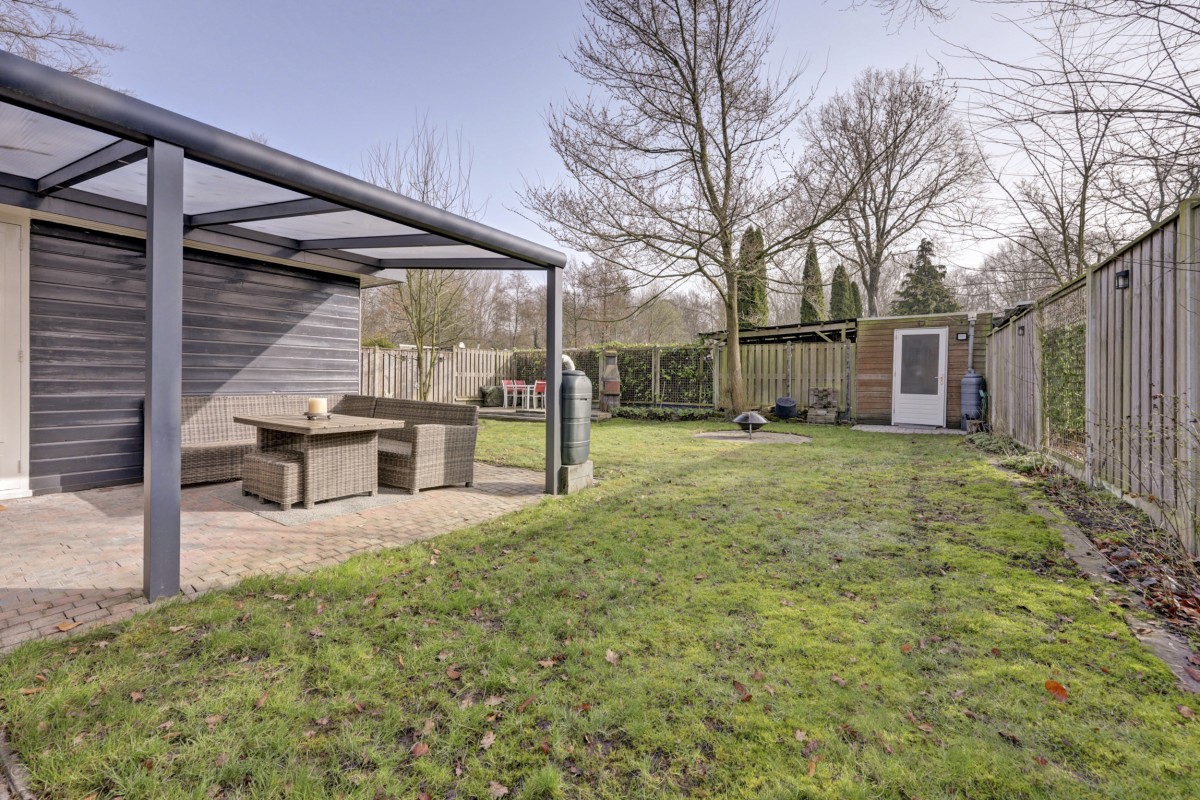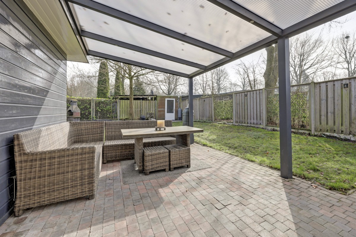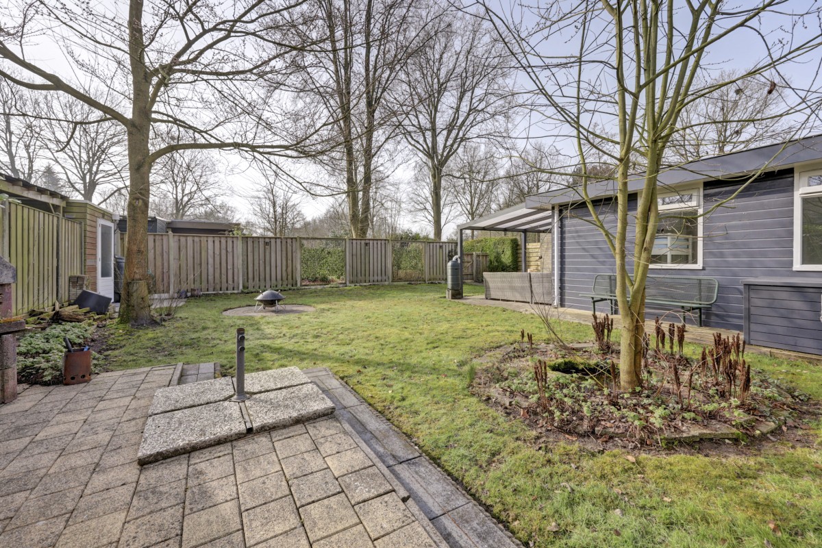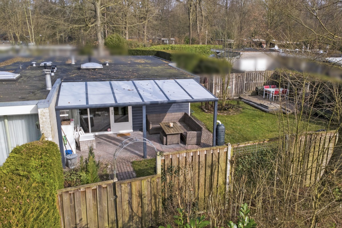 Lees verderAdditionally, the home features HR+ and HR++ glazing, contributing to extra comfort. Inside, you will find a neat and well-maintained finish. The walls are fitted with glass fiber wallpaper, and the ceilings are smoothly plastered. The floor features modern PVC flooring that provides a calm and contemporary look; extra PVC flooring is included for a potential extension of the bungalow. The kitchen has been renovated and is equipped with a built-in refrigerator, gas hob, extractor hood, and central heating boiler. The bathroom has also been renovated and features a walk-in shower, wall-mounted toilet, and washbasin. The bungalow has two bedrooms and a practical layout, providing ample space for a comfortable stay. Under the covered patio, you can also enjoy the sheltered green and peaceful surroundings outdoors. There is also a storage shed on the property, ideal for storing bicycles, garden furniture, or recreational equipment.