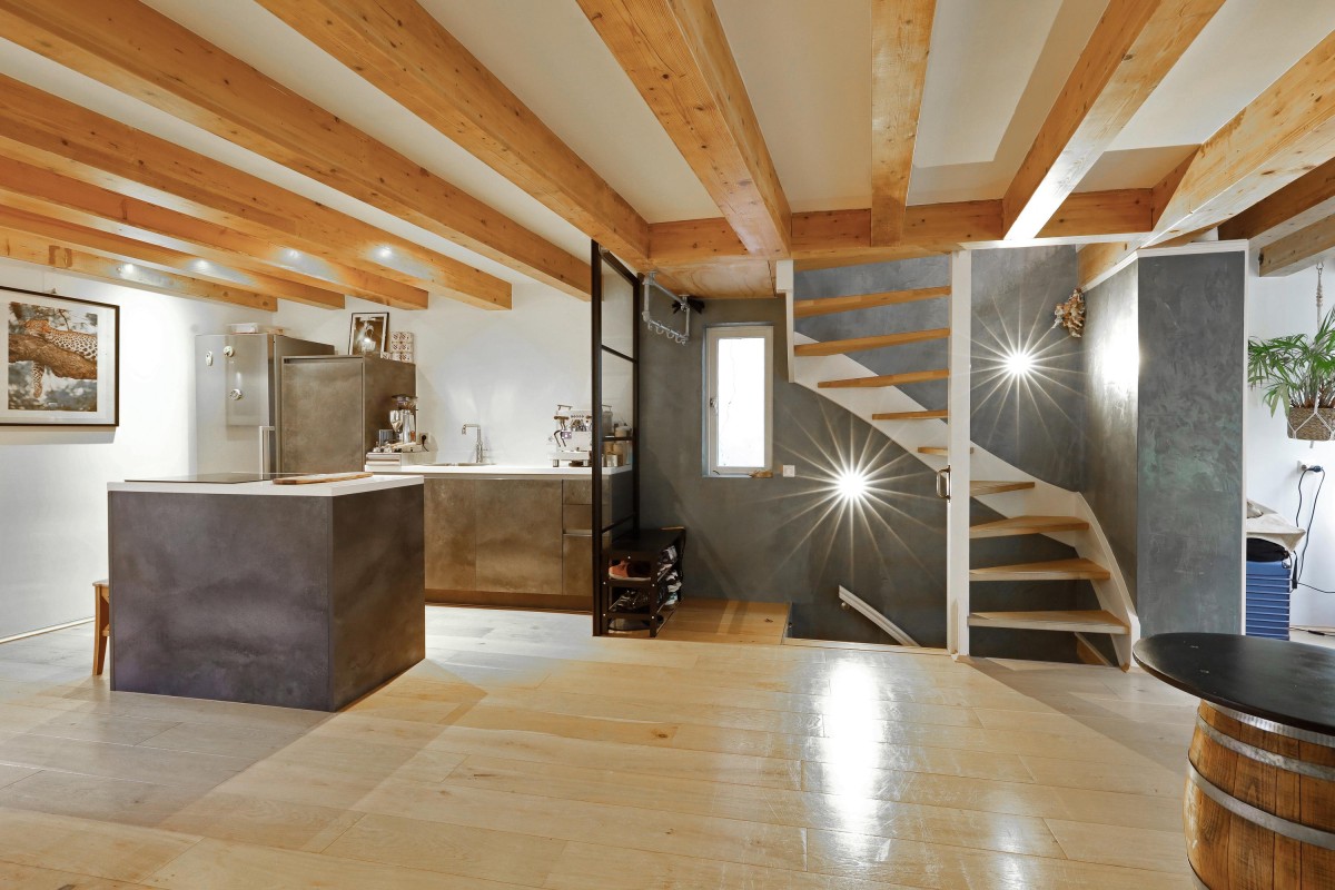 Through the private entrance of the house you enter the hall. The staircase leads to the spacious living room with open kitchen.