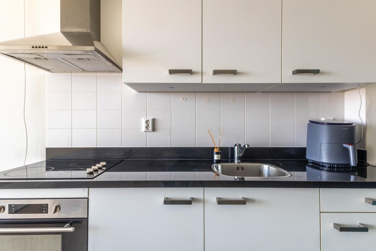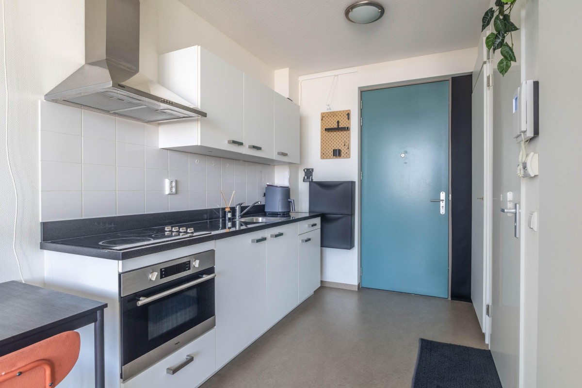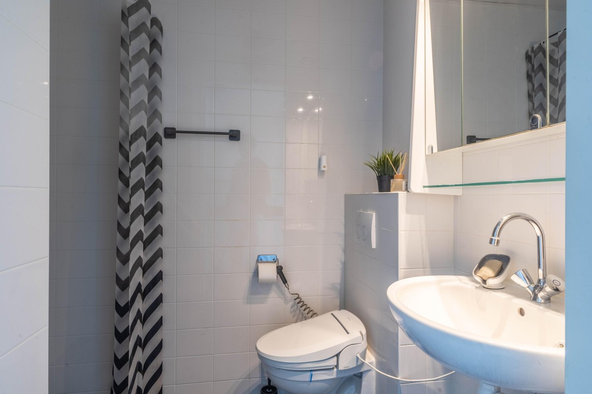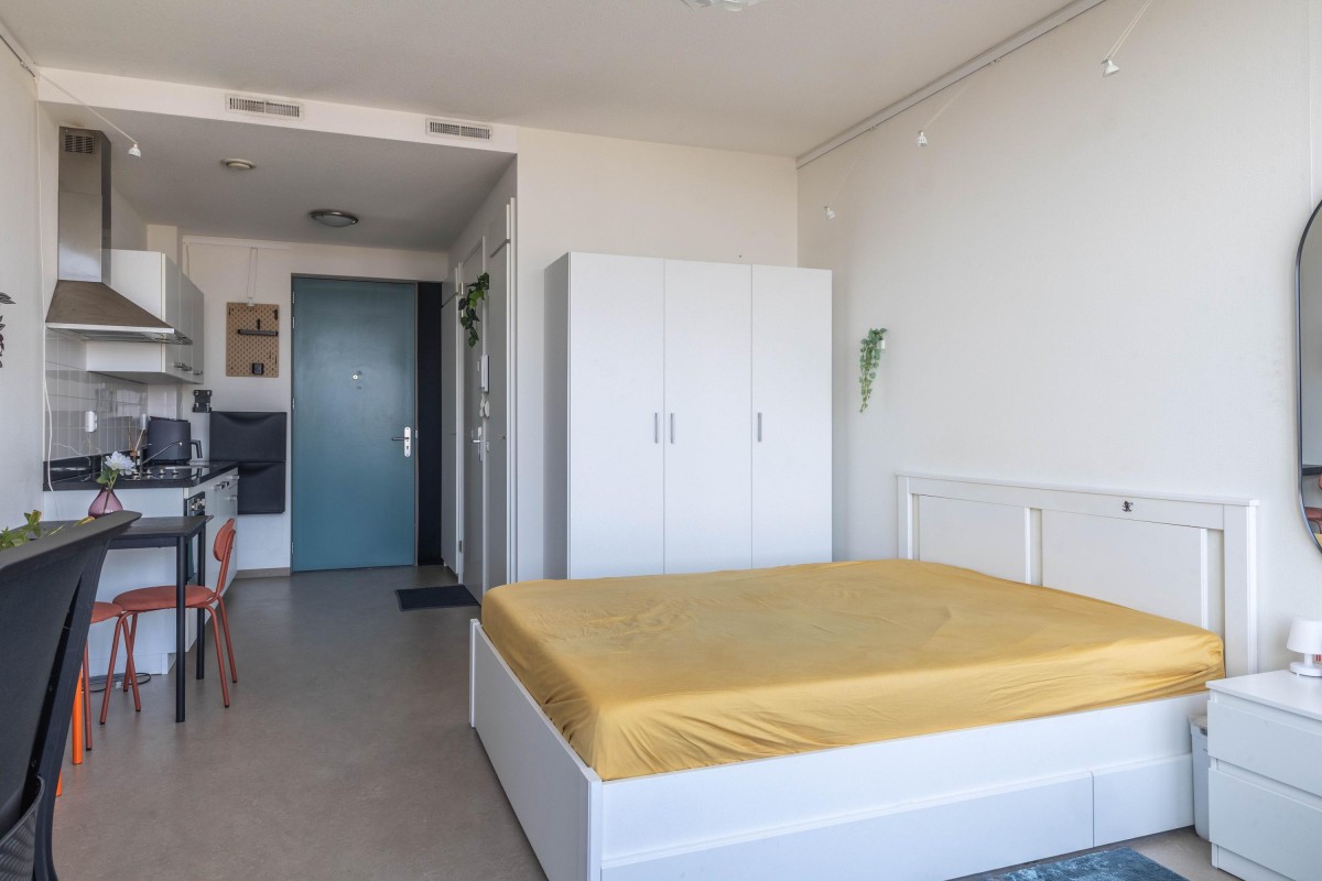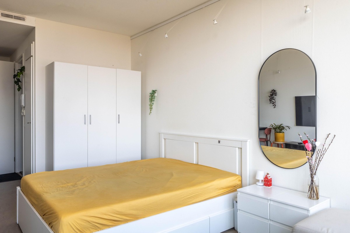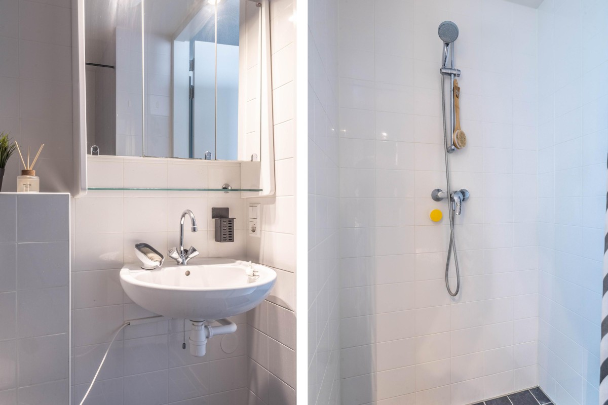 Upon entering, you immediately step into the open kitchen at the front of the studio. The modern, sleek white kitchen is equipped with various built-in appliances, including an induction cooktop, fridge and freezer, and a stainless steel extractor fan. The bathroom is fully tiled and features a sink, toilet, and walk-in shower. The living area is located at the rear of the studio. The apartment is well insulated. If desired, a room divider can easily create a separate sleeping area or a workspace/study corner. The studio also includes underfloor heating, underfloor cooling, and air conditioning. Additionally, a video intercom is installed.