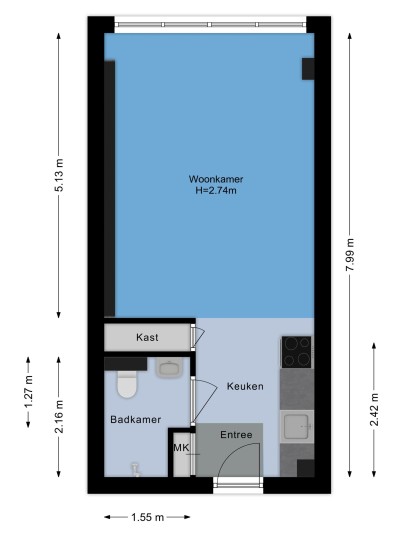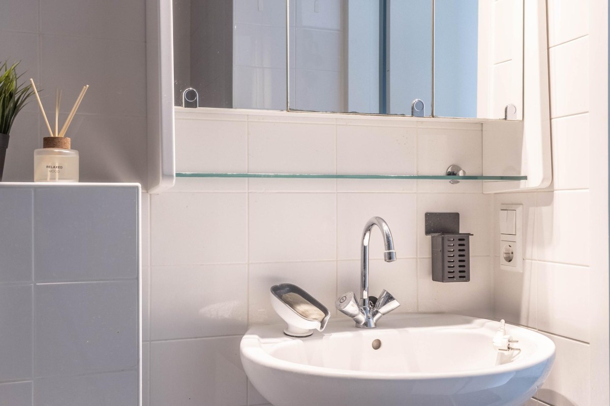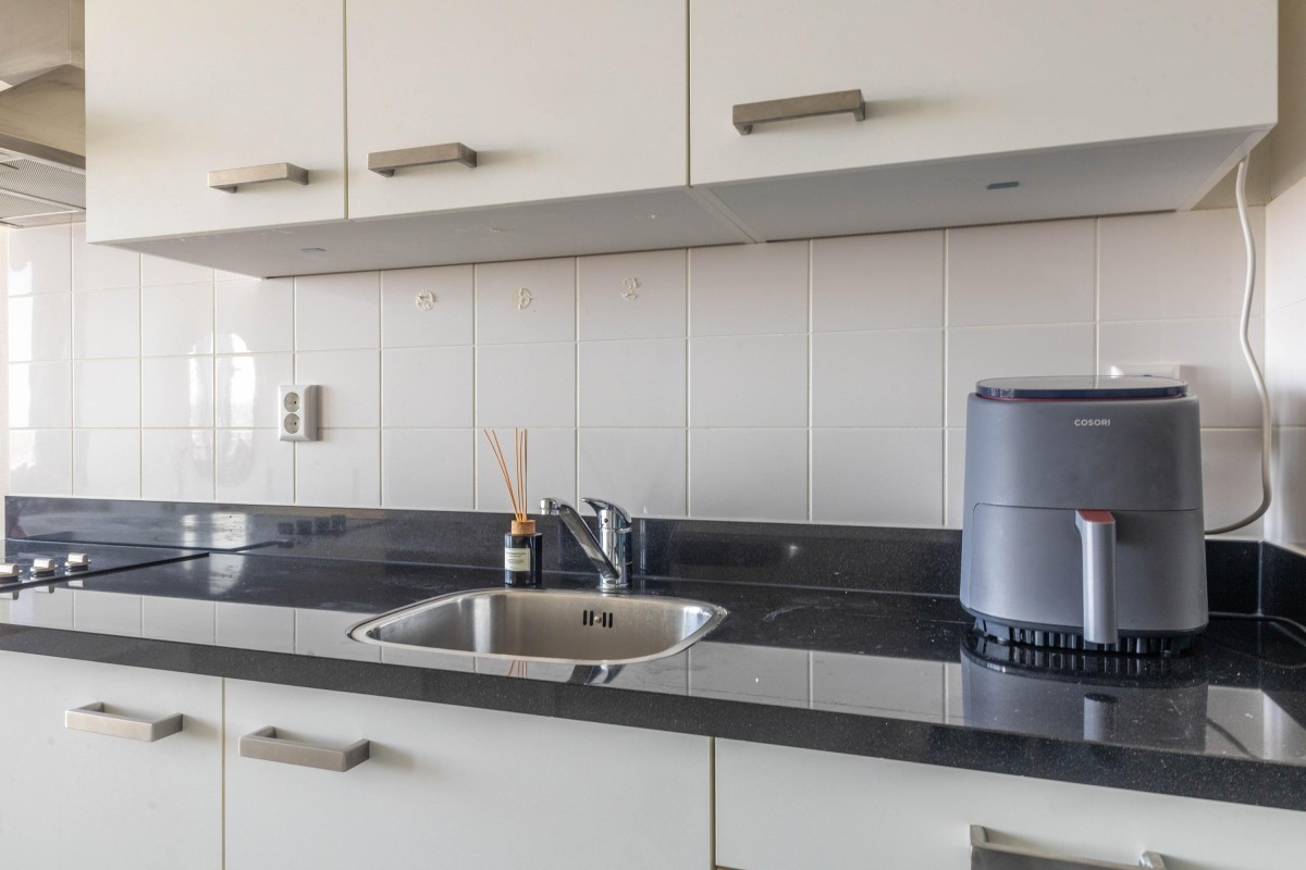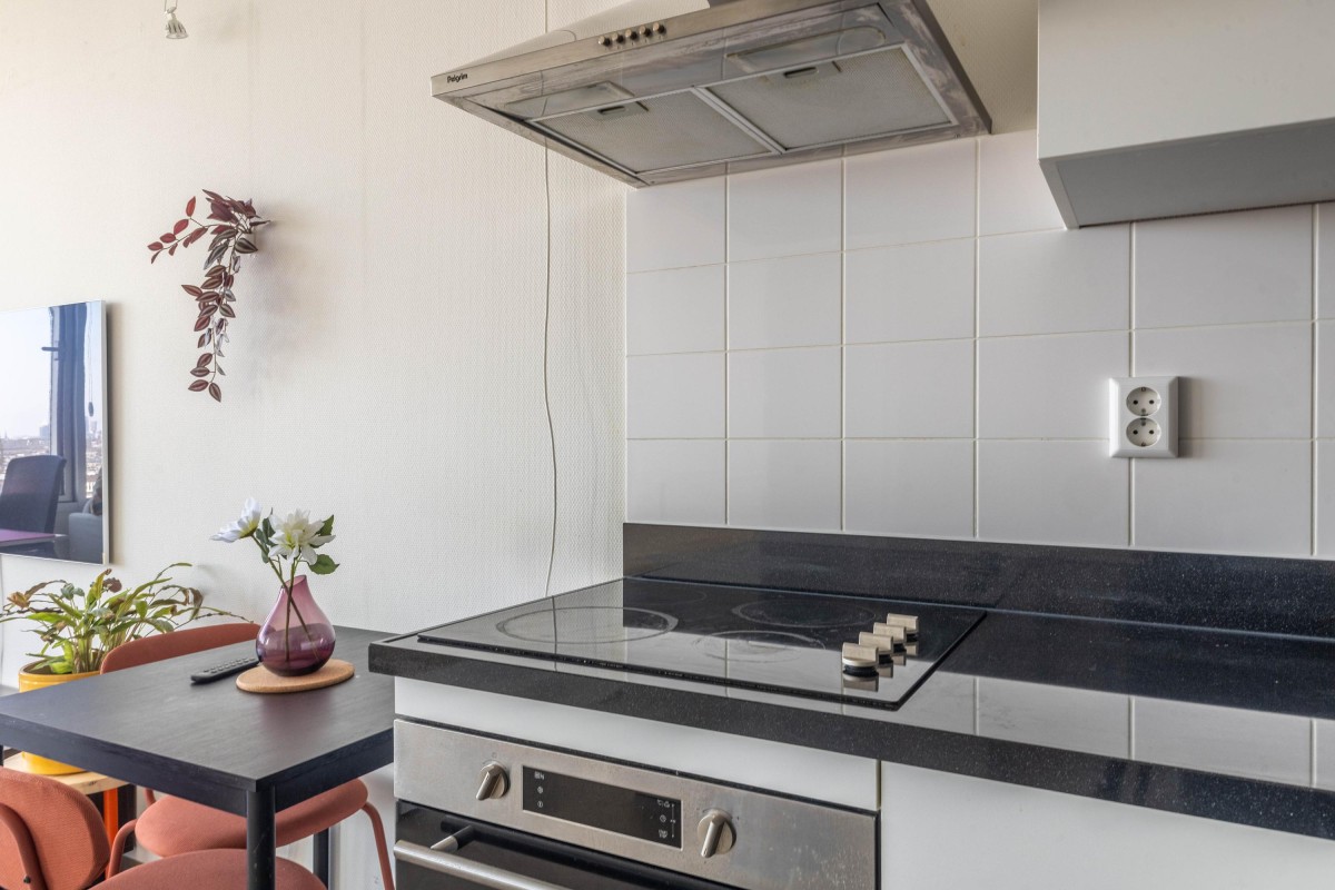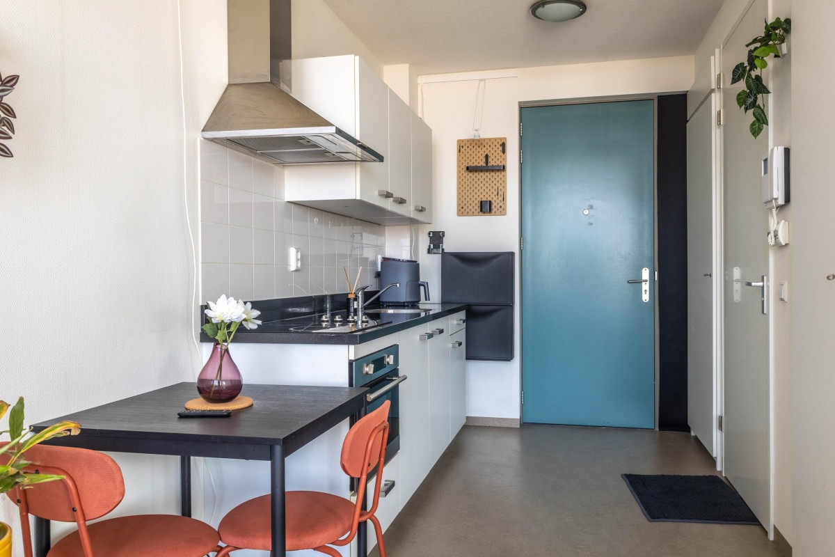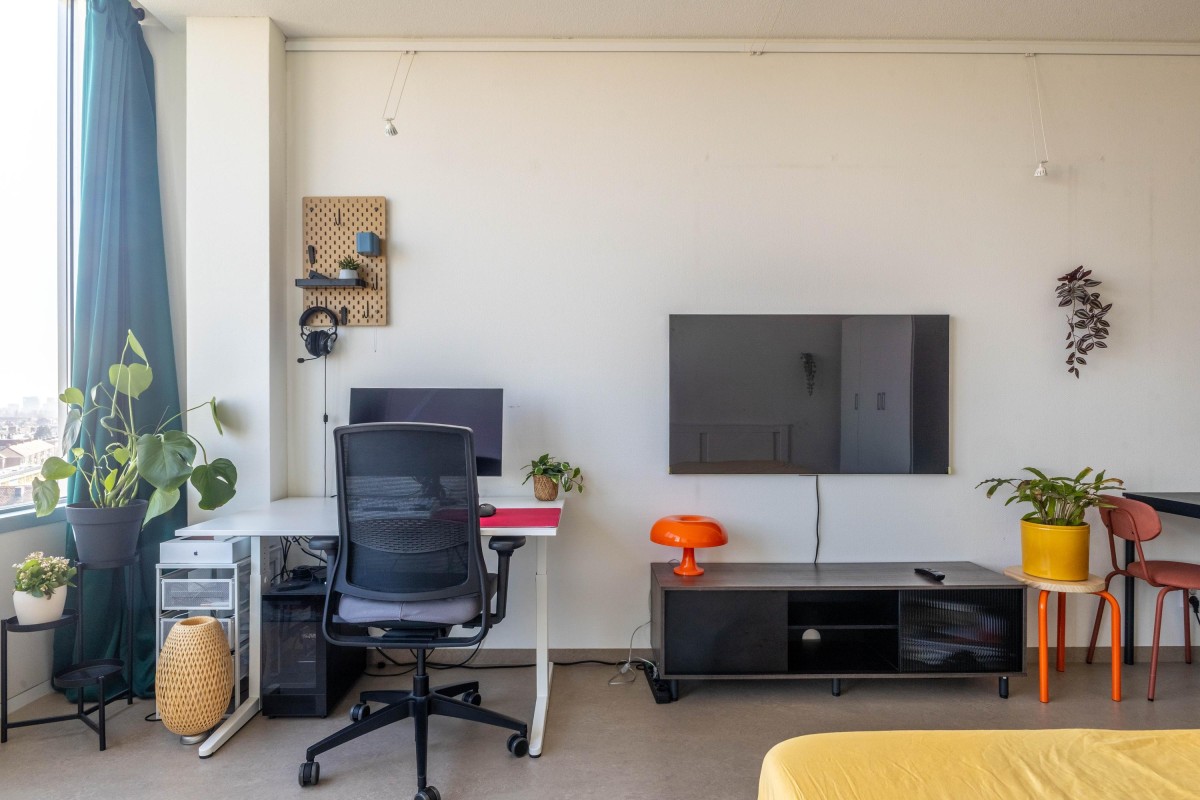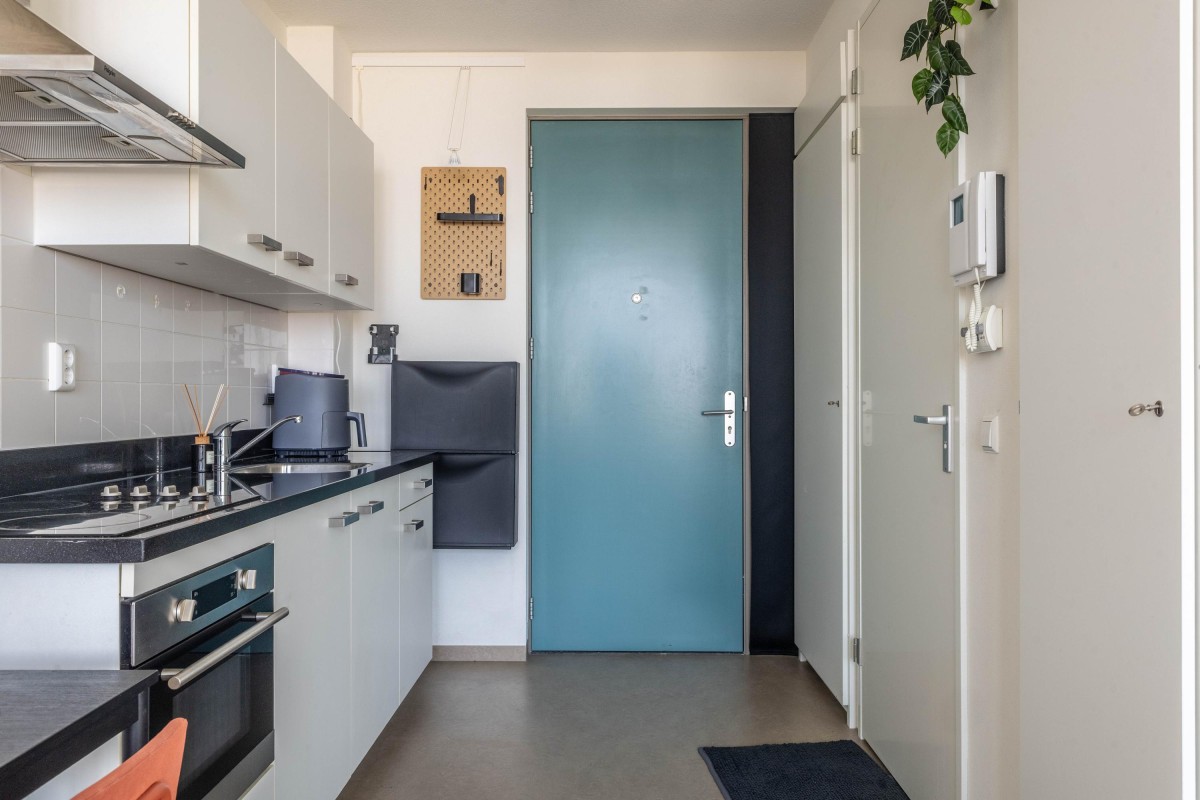Upon entering, you immediately step into the open kitchen at the front of the studio. The modern, sleek white kitchen is equipped with various built-in appliances, including an induction cooktop, fridge and freezer, and a stainless steel extractor fan. The bathroom is fully tiled and features a sink, toilet, and walk-in shower. The living area is located at the rear of the studio. The apartment is well insulated. If desired, a room divider can easily create a separate sleeping area or a workspace/study corner. The studio also includes underfloor heating, underfloor cooling, and air conditioning. Additionally, a video intercom is installed.