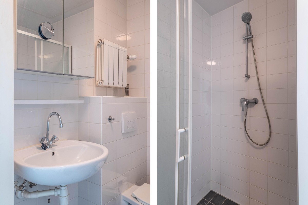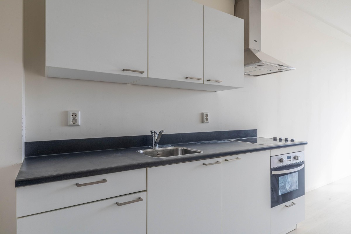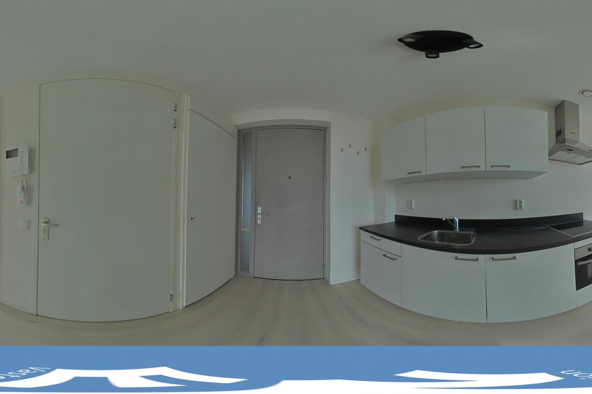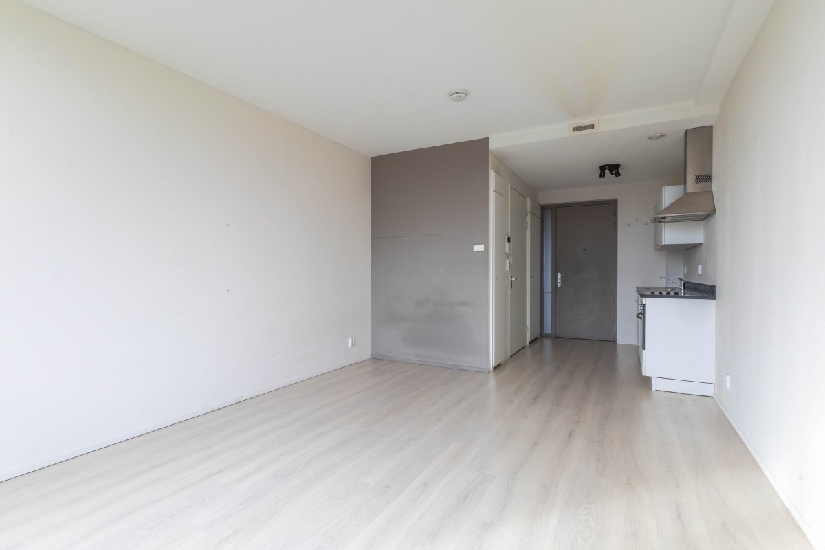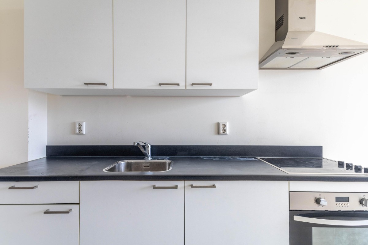 Upon entering, you immediately find yourself in the open kitchen at the front of the studio. The modern kitchen, with a sleek white finish, is equipped with various built-in appliances, including an induction cooktop, refrigerator and freezer, and a stainless steel extractor fan. The bathroom is fully tiled and comes with a sink, toilet, and walk-in shower. The living area is at the back of the studio. The apartment is well-insulated. If desired, you can easily create a separate sleeping area or a work/study space with a room divider. The studio features underfloor heating, underfloor cooling, and air conditioning. There is also an intercom system present.