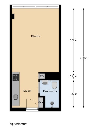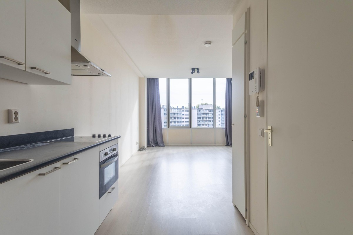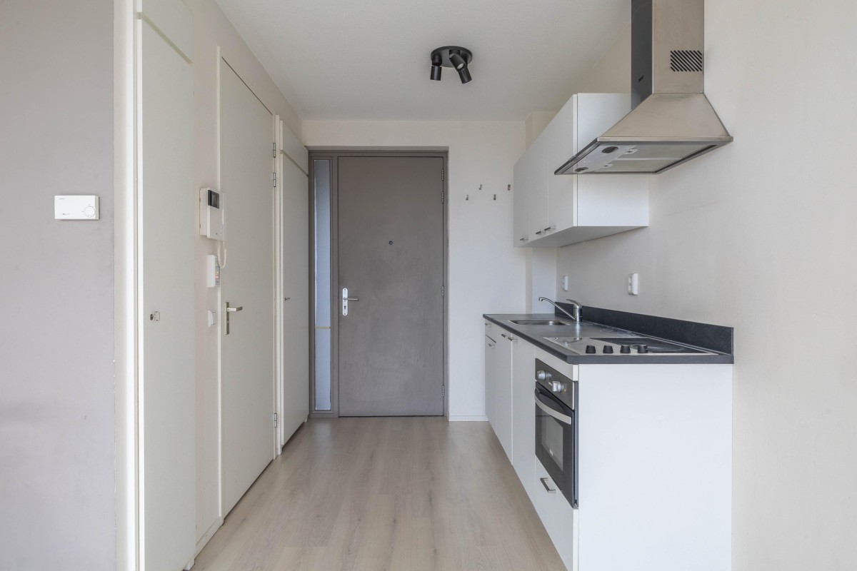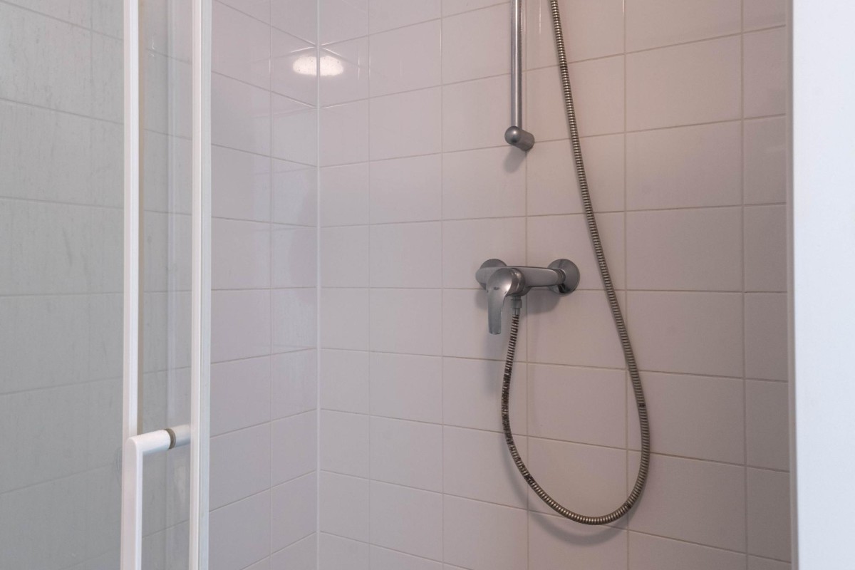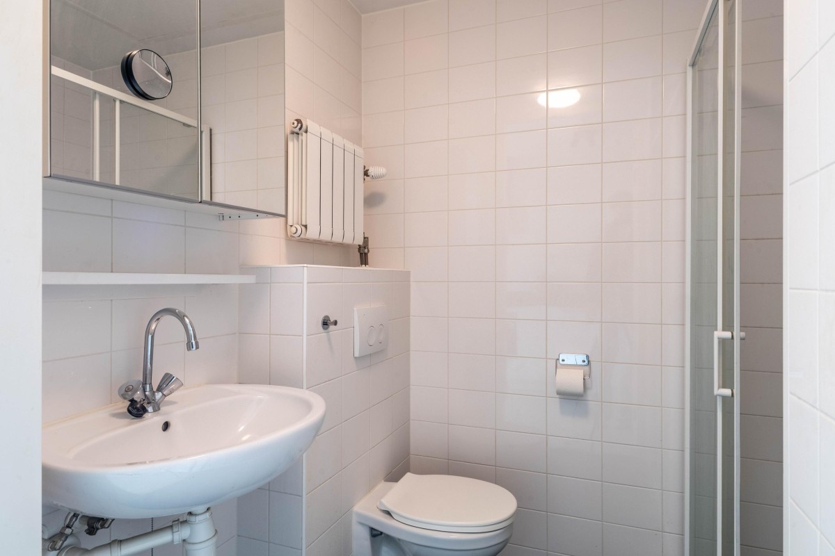 Upon entering, you immediately find yourself in the open kitchen at the front of the studio. The modern kitchen, with a sleek white finish, is equipped with various built-in appliances, including an induction cooktop, refrigerator and freezer, and a stainless steel extractor fan. The bathroom is fully tiled and comes with a sink, toilet, and walk-in shower. The living area is at the back of the studio. The apartment is well-insulated. If desired, you can easily create a separate sleeping area or a work/study space with a room divider. The studio features underfloor heating, underfloor cooling, and air conditioning. There is also an intercom system present.