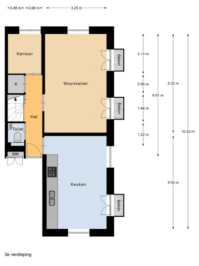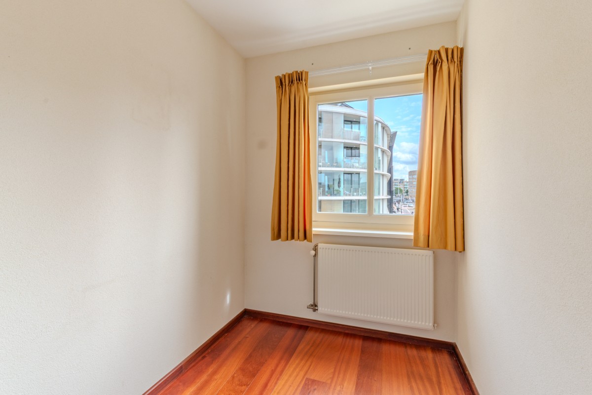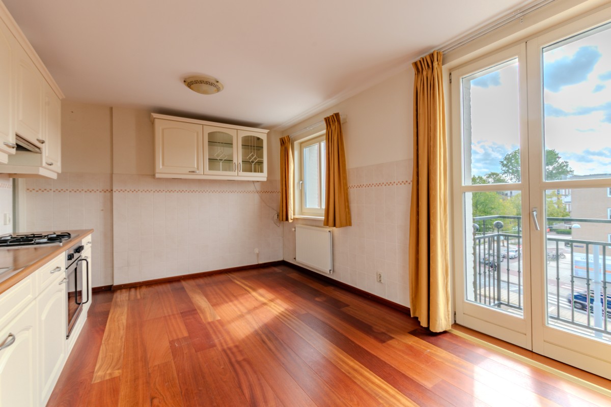 Upon entering, you walk into a hallway that provides access to the kitchen, living room, a bedroom/office, and a separate toilet with a sink. The living room and kitchen are both situated on a corner, allowing for plenty of natural light. The living room has two charming balconies, and the kitchen also provides access to a similar balcony. The living room and kitchen are separated by a wall. It is possible to integrate the kitchen and the small bedroom into the living room, creating a very spacious living room/kitchen. The kitchen is equipped with built-in appliances..