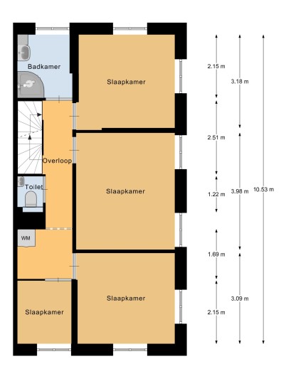 A fixed staircase leads to the landing. On this floor, there are four bedrooms, a bathroom, and a separate toilet. Three of the bedrooms are generously sized; the fourth is smaller.
