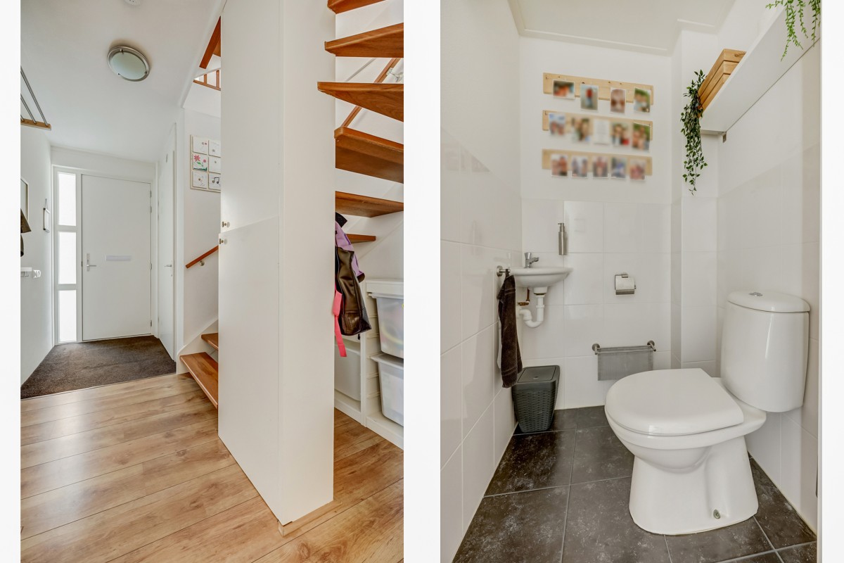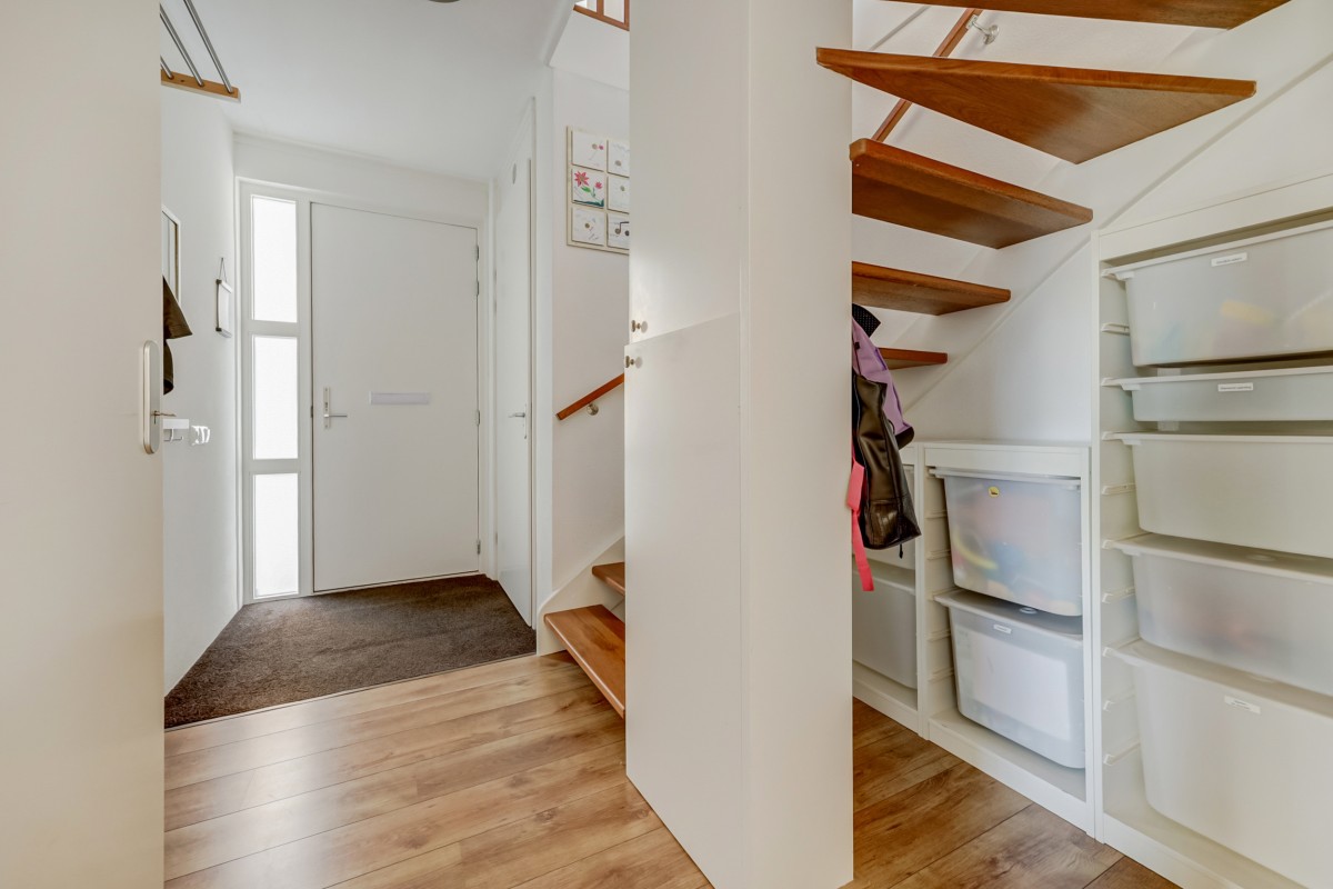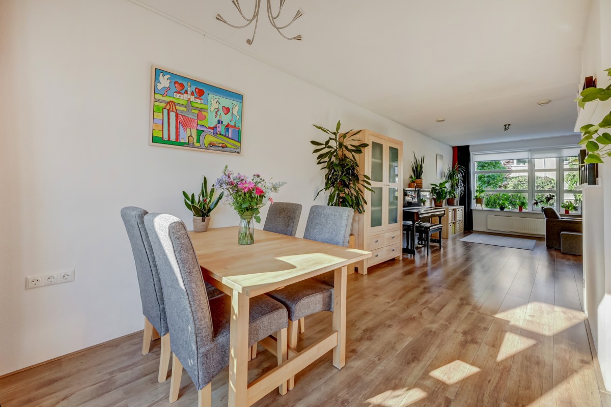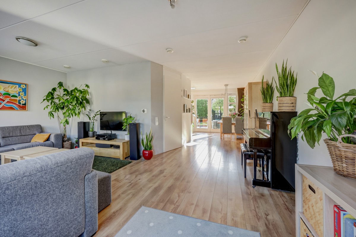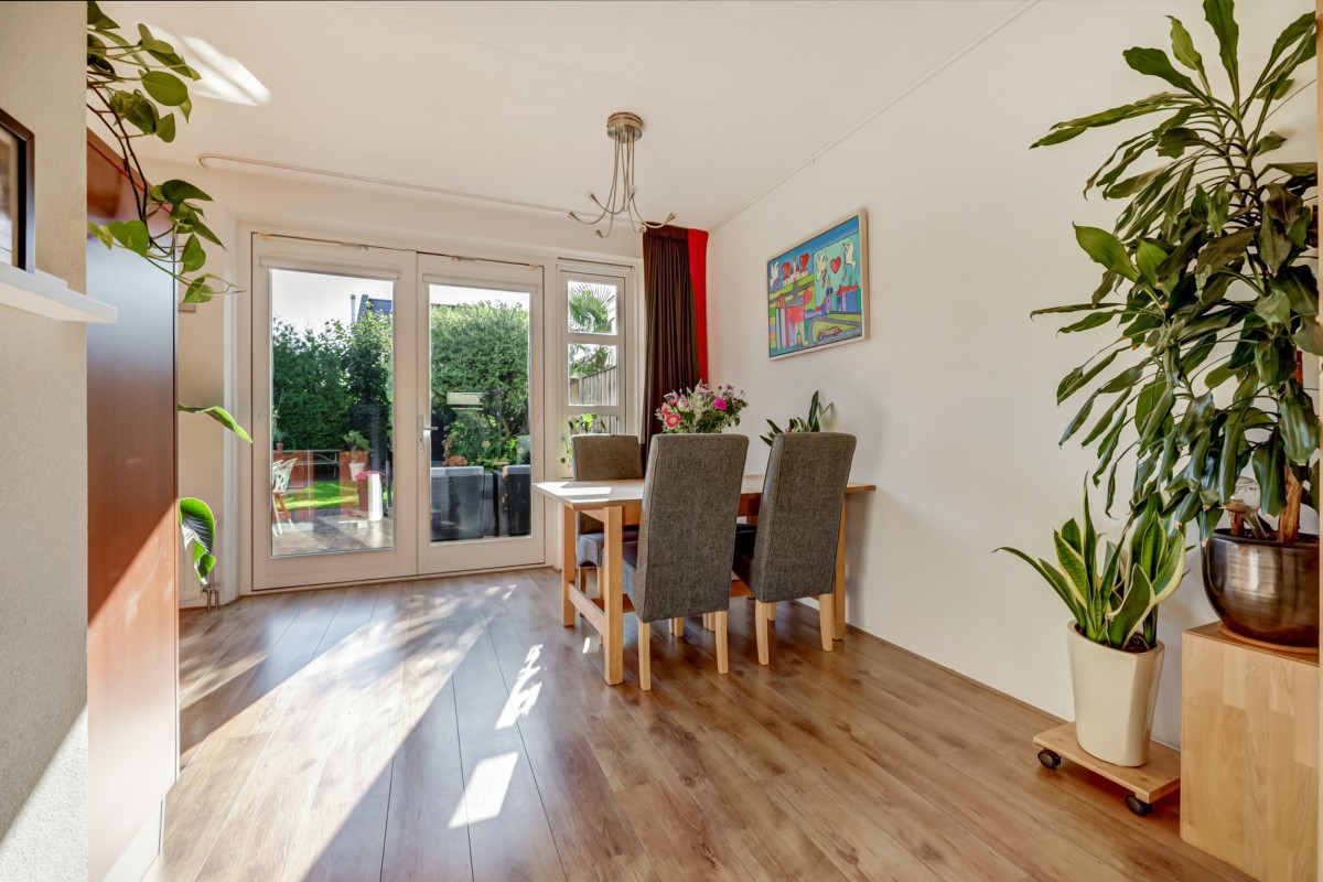 Begane grond: overdekt entree, hal met meterkast, garderobe, toiletruimte, trapopgang en doorgang naar de woonkamer. De straatgerichte woonkamer is dankzij de vele raampartijen heerlijk licht. Aan de achterzijde bevindt zich de eethoek met dubbele openslaande deuren naar de tuin. Aansluitend is de in een hoek opgestelde keuken gesitueerd, voorzien van koelkast, vaatwasser, combi-magnetron, 5-pits gas-op-glas kookplaat, RVS-afzuigschouw, 1½ spoelbak en composiet-aanrechtblad met smetrand. Vanuit de keuken is er ook toegang tot de verzorgde achtertuin, die dankzij de ruime maatvoering volop zonmogelijkheden biedt.