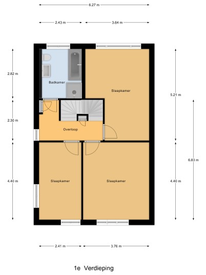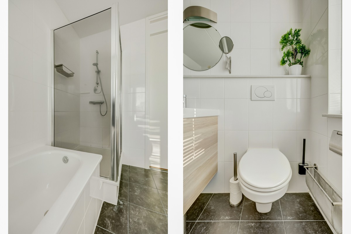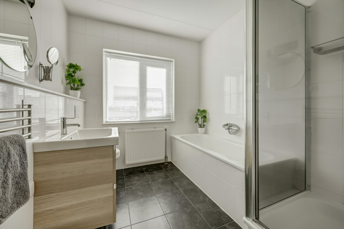 Eerste verdieping: overloop met zijgevelraam en leidingkast, aansluitend drie royale slaapkamers en de badkamer. De slaapkamers zijn voorzien van laminaatvloeren, rolluiken en horren. De badkamer is volledig betegeld en uitgerust met een douchecabine, ligbad, hangend toilet en wastafel.