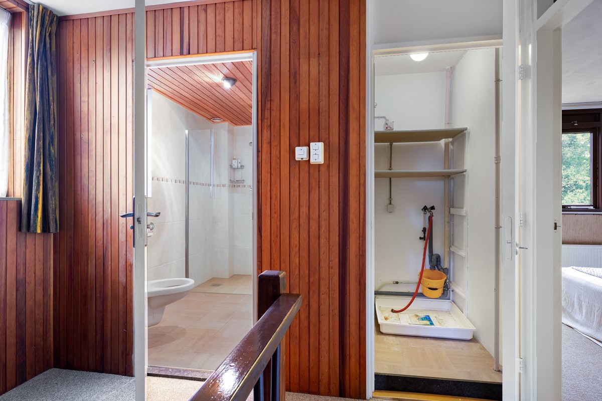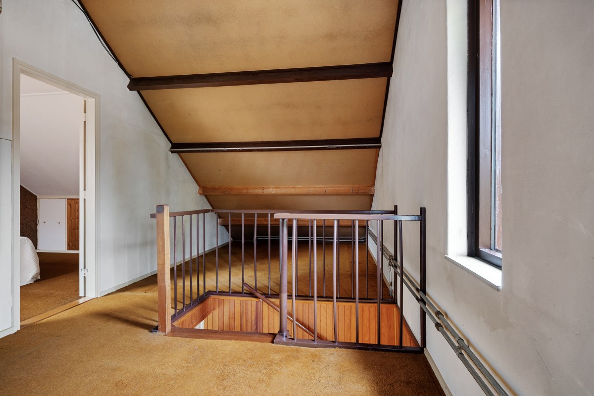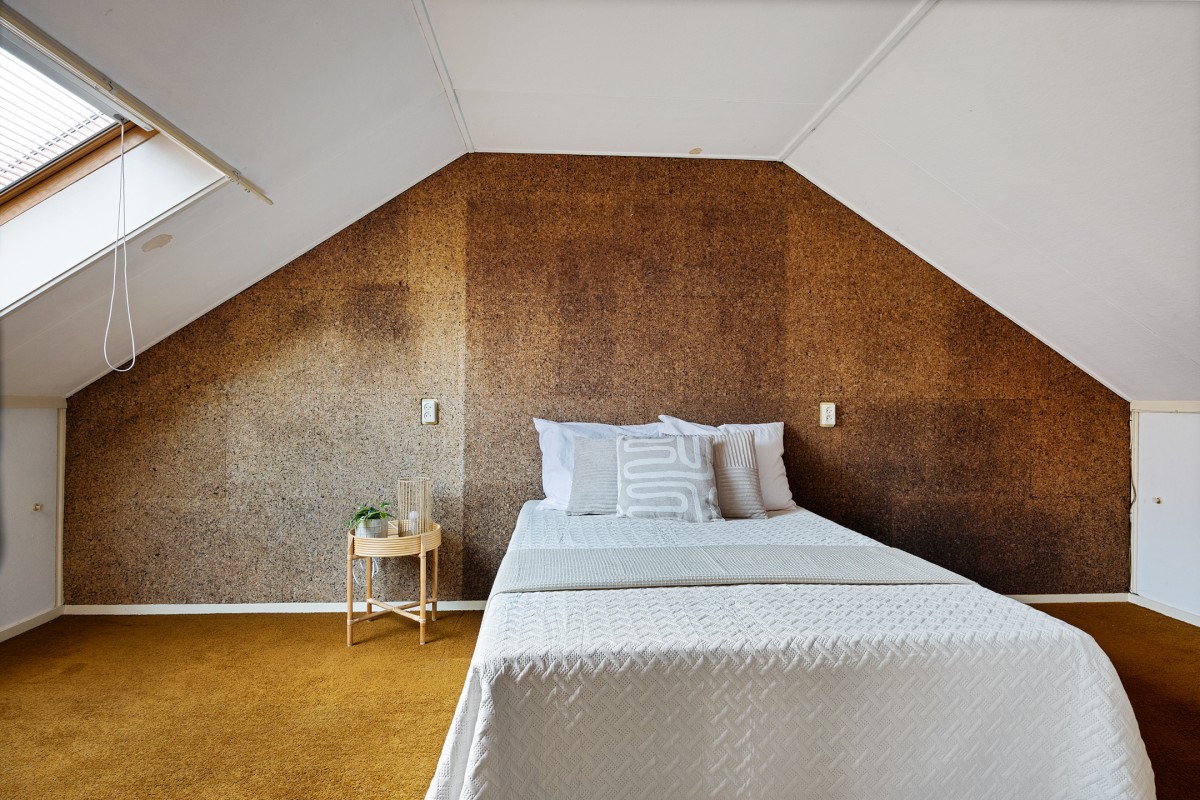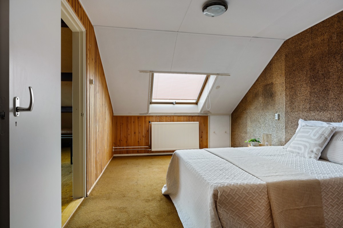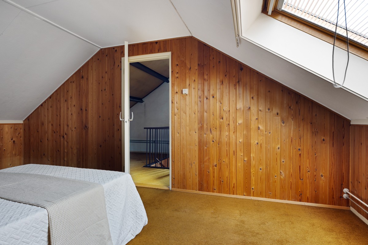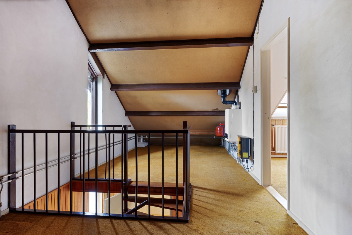 De overloop biedt toegang tot een praktische opstelplaats voor de cv-ketel en de omvormer voor de zonnepanelen. Vanuit hier is er ook toegang tot de vierde slaapkamer, voorzien van een Velux dakraam dat voor veel natuurlijk licht zorgt. De kamer is verder afgewerkt met knieschotten, die handige opbergruimte bieden.