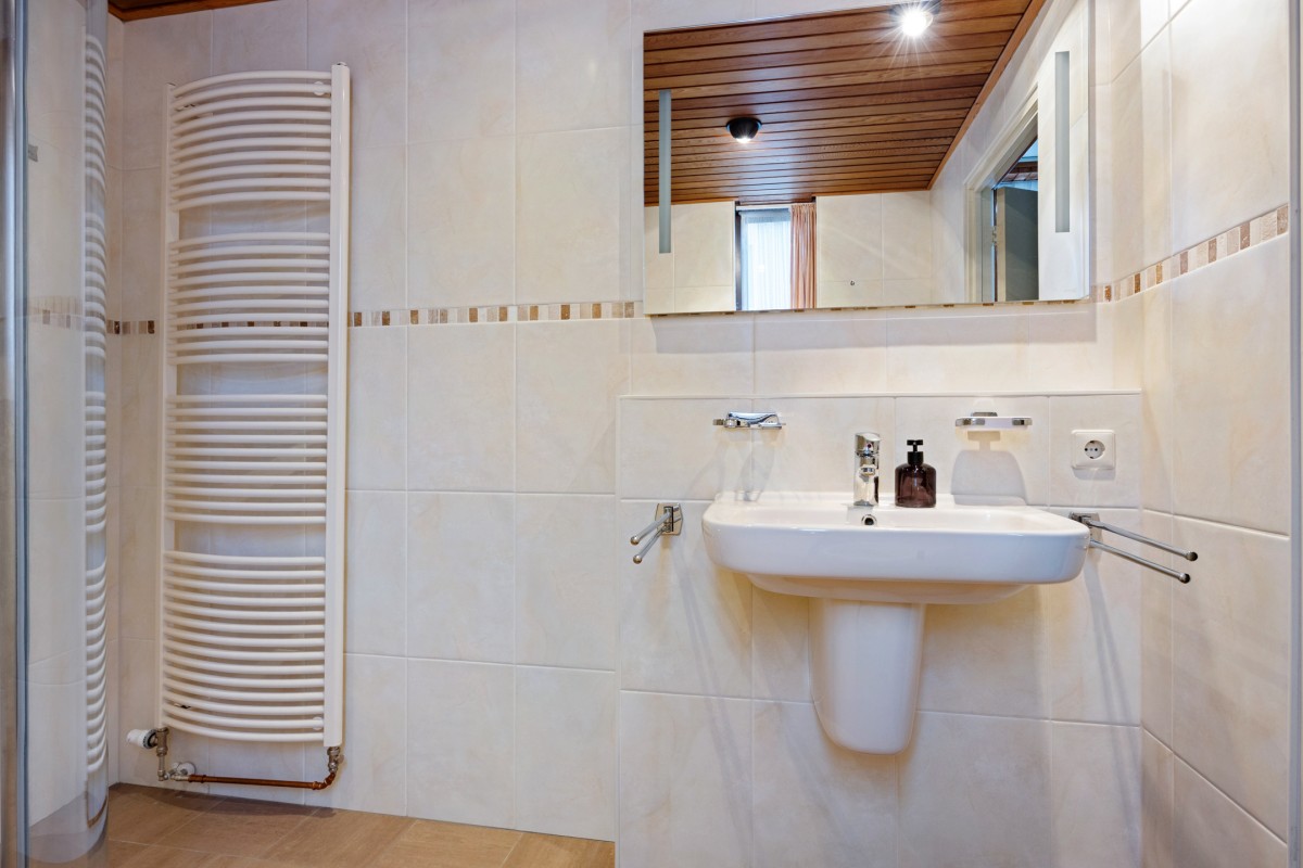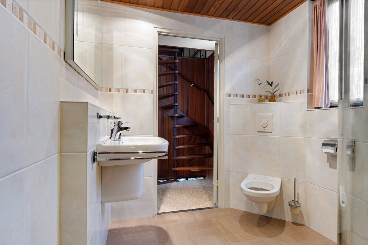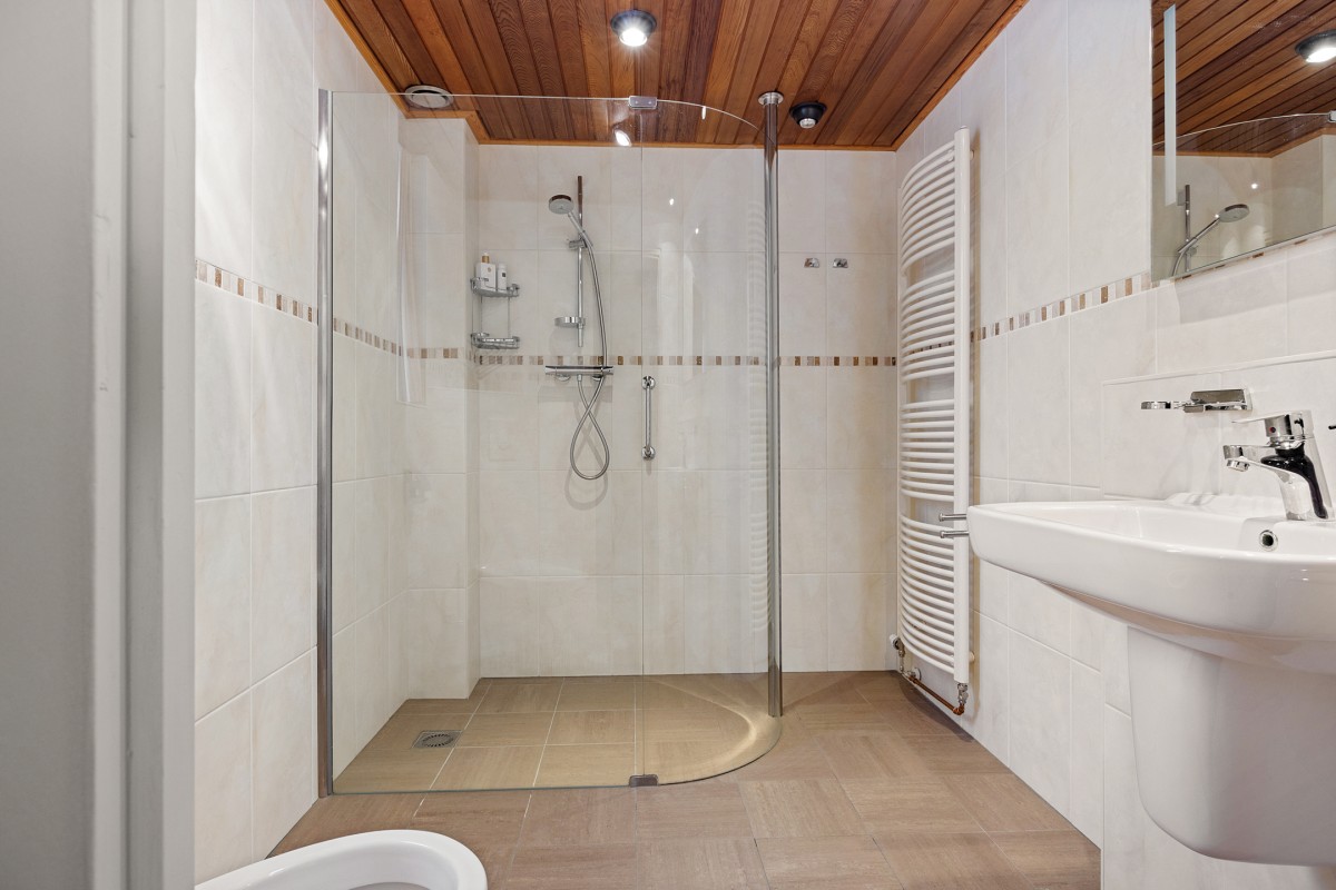 De nette badkamer is voorzien van een douche, wastafel en een vrij-hangend toilet.