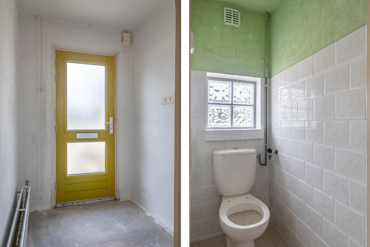 Through your own front garden, you reach the entrance and step into the vestibule. From here, you have access to an indoor storage room with an adjacent toilet. You can also enter the rest of the house from the vestibule.