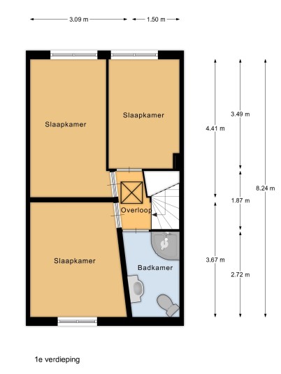 A fixed staircase leads to the first floor, where at the rear there are two generously sized bedrooms, and at the front, you will find the third bedroom. The bathroom is equipped with a shower, toilet, and washbasin with cupboard space.