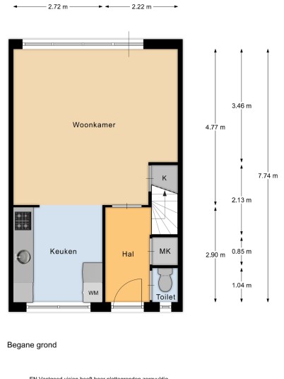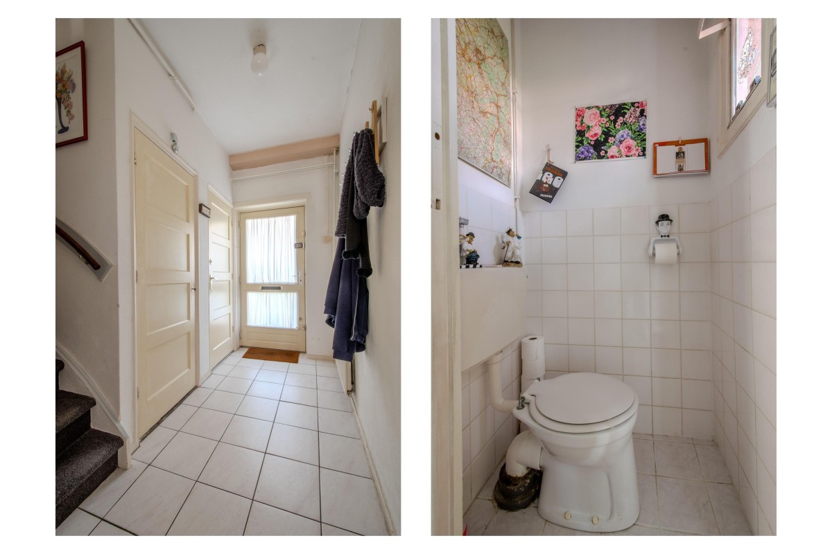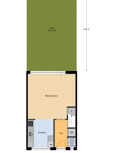 Entrance hall with toilet and meter cupboard. Garden-facing living room with a practical under-stairs cupboard and access to the sunny back garden. The open-plan kitchen is located at the front.