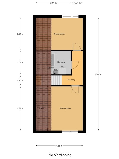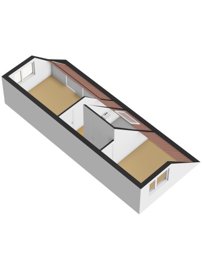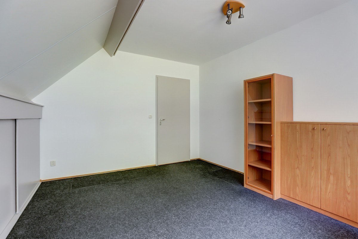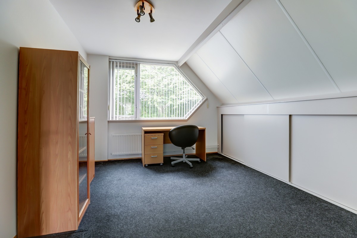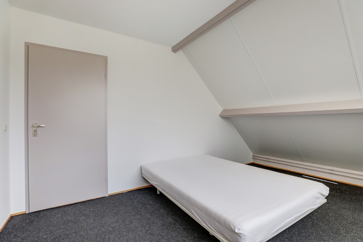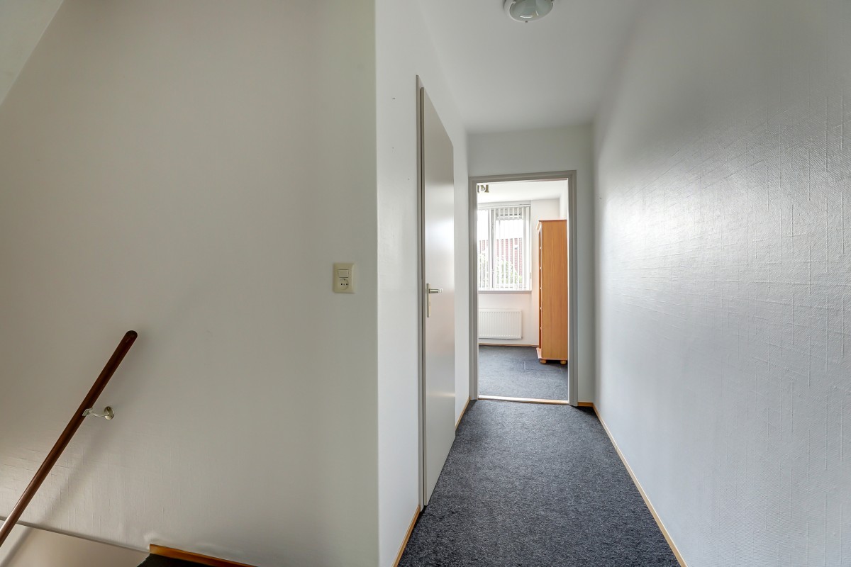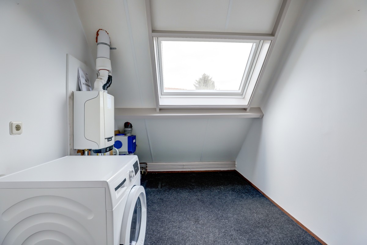 1e verdieping: overloop met aansluitend 2 mooie slaapkamers en een ruime berging. De berging is voorzien van een kunststof Velux dakraam en de opstelplaats voor de Remeha HR c.v.-ketel en wasmachine. De knieschotten onder het schuine dak geeft de nodige bergruimte.