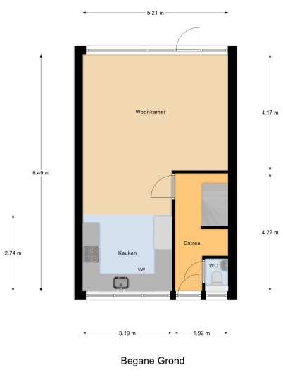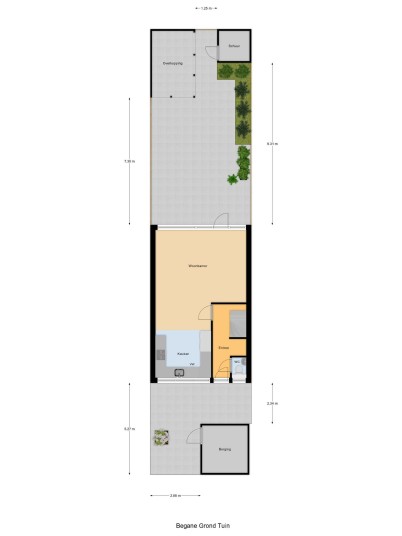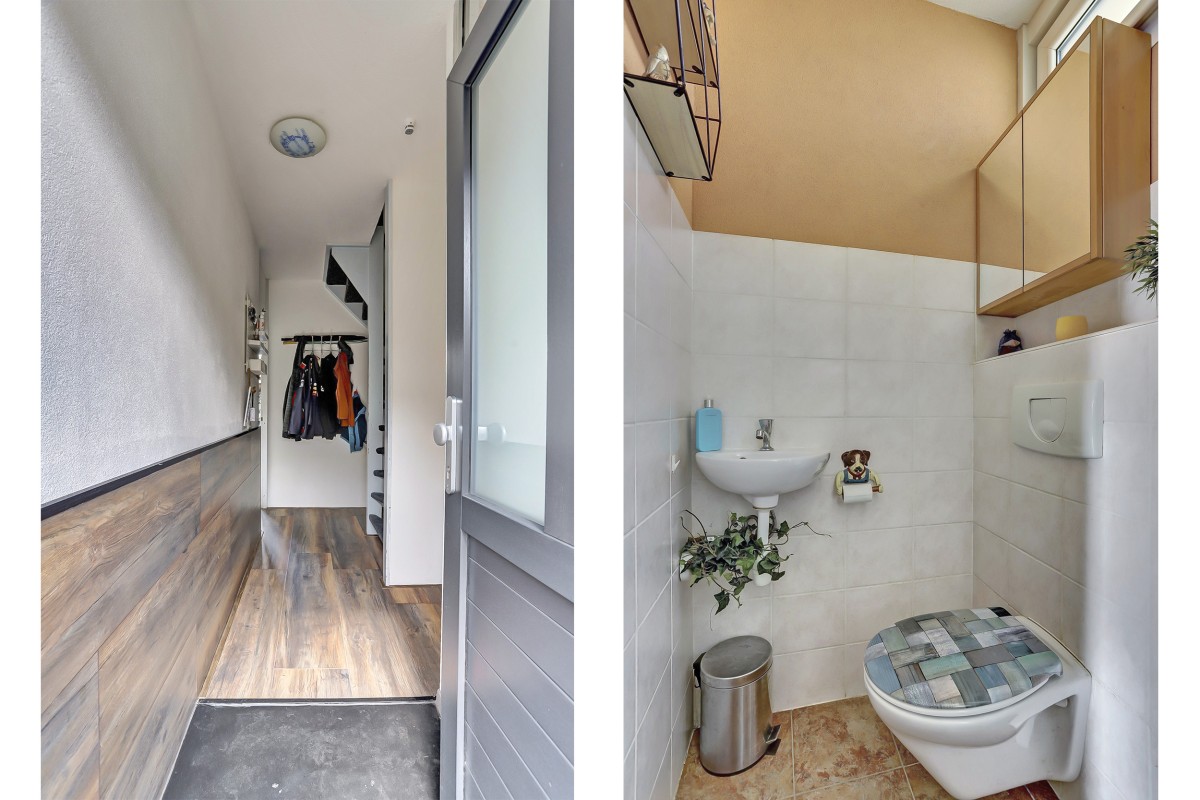 Begane grond: entree, hal met uitgebreide meterkast, toiletruimte met hangcloset en fonteintje, doorgang naar de woonkamer. De woonkamer is aan de achterzijde van de woning gelegen.