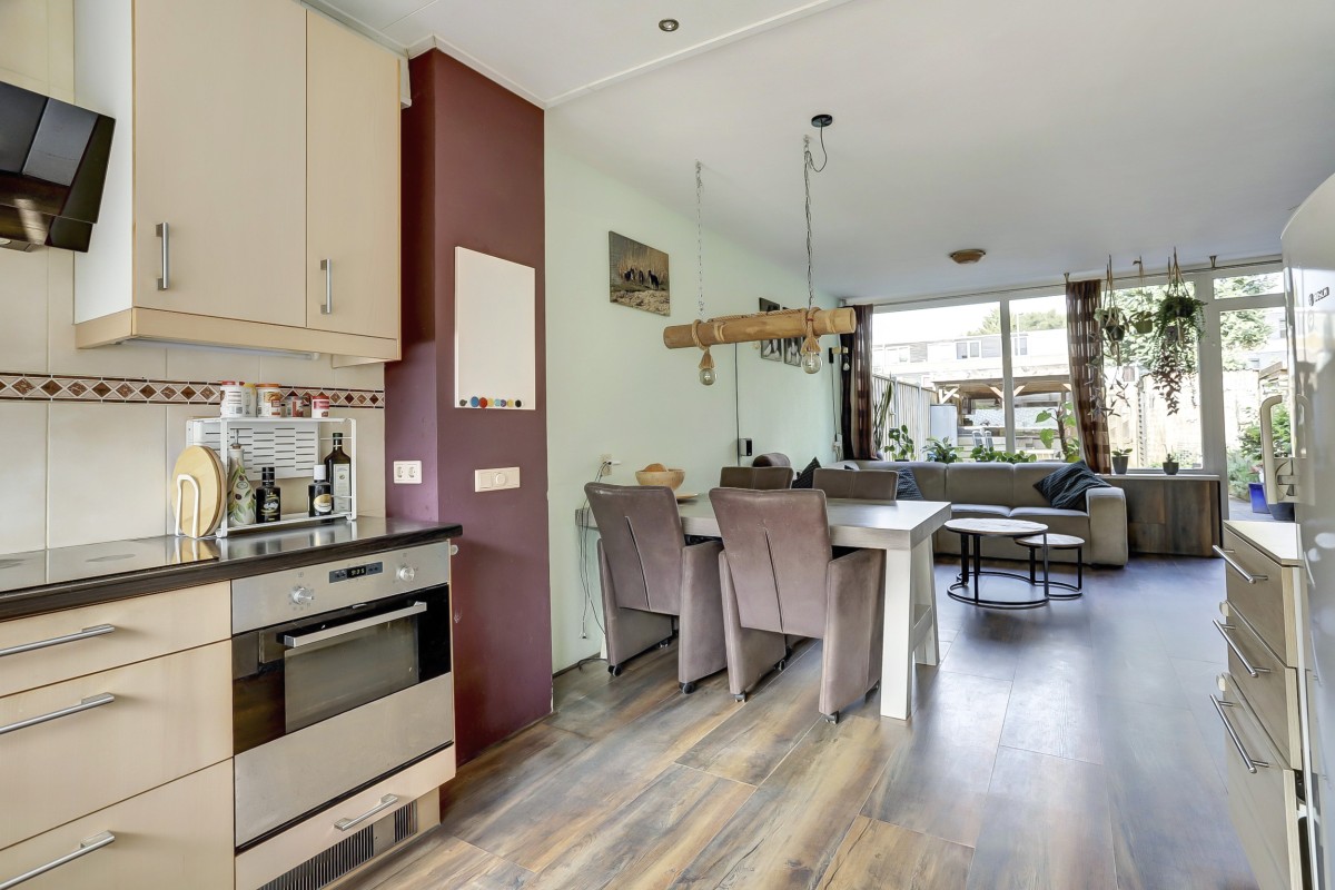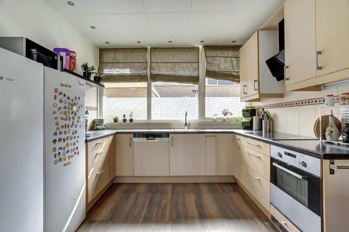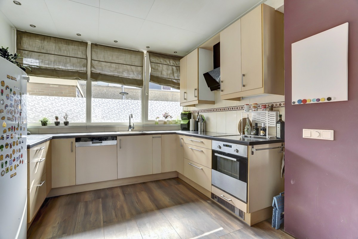 Lees verderAan de voorzijde van de woning bevindt zich de keuken in een hoekopstelling en voorzien van een losse koelkast, vrieskast, ingebouwde vaatwasser, combimagnetron, en inductiekookplaat en recirculatie afzuiging. Vanuit de woonkamer is er middels een vernieuwde loopdeur toegang tot de onderhoudsarme tuin, welke op het westen is gelegen en aan openbaar groen grenst.