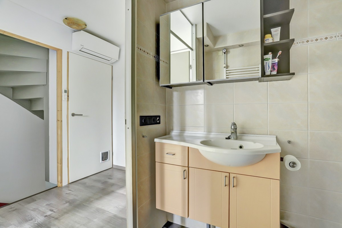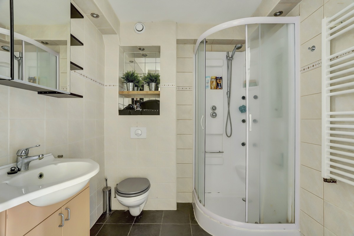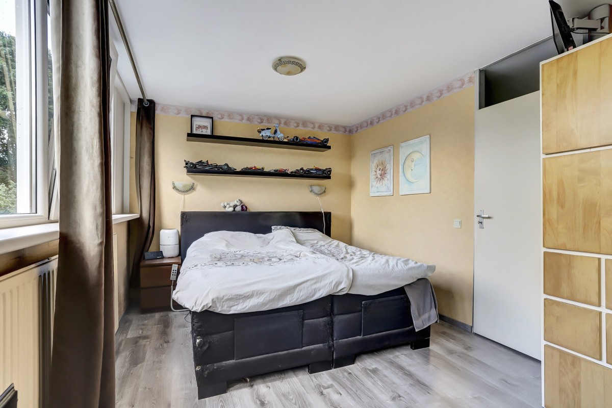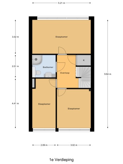 Eerste verdieping: overloop met berging en aansluitend toegang tot de badkamer en de 3 ruime slaapkamers. De badkamer is voorzien van een 2e hangcloset, douche met cabine en wastafel met meubel. De overloop en slaapkamers zijn voorzien van laminaatvloeren.