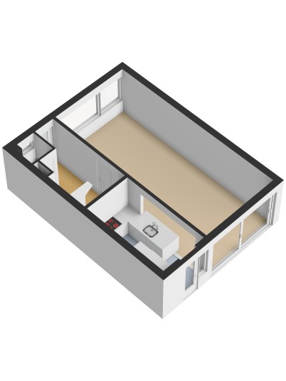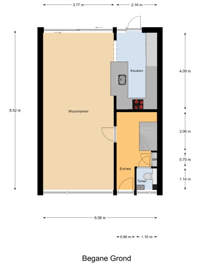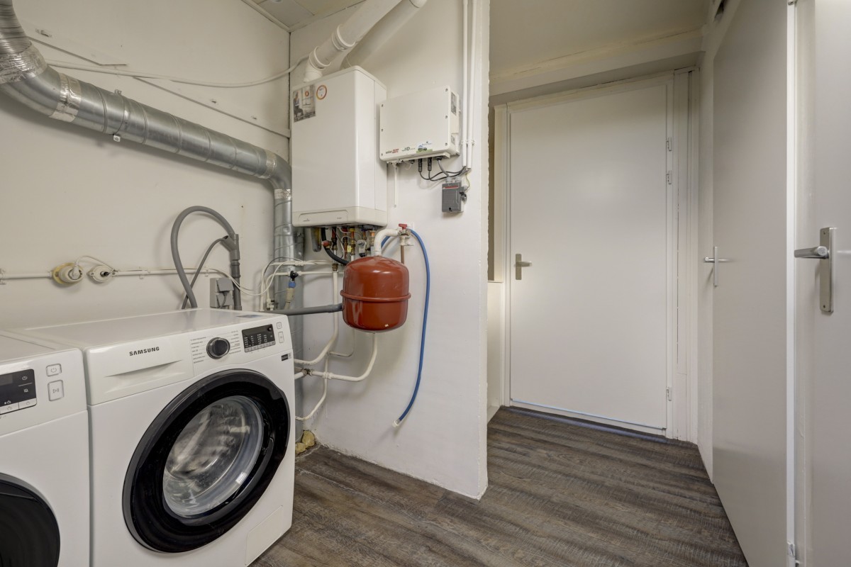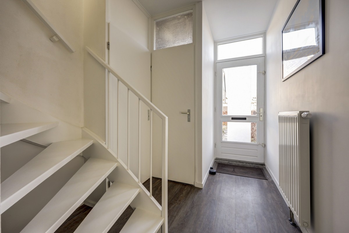 Begane grond: entree, hal met trapopgang en modern toilet (hangend closet en fonteintje). Lichte doorzonwoonkamer met schuifpui naar de achtertuin. Open keuken met spoeleiland en inbouwapparatuur, waaronder koelkast, vriezer, vaatwasser, combimagnetron, inductiekookplaat en afzuigkap. Vanuit de keuken eveneens toegang tot de tuin.